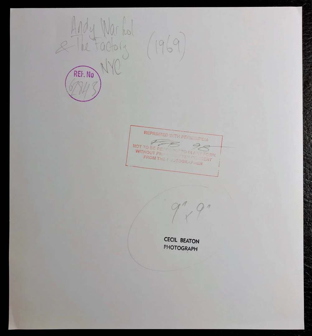 A portrait of Andy Warhol at The Factory taken by Cecil Beaton in 1969. The photograph was printed in 1998 on double weight slight gloss paper. Original Publication Photo, measuring approximately 10 inches by 10.5 inches.