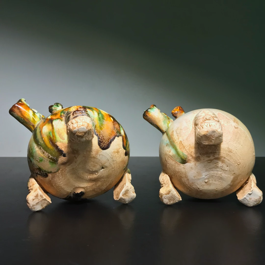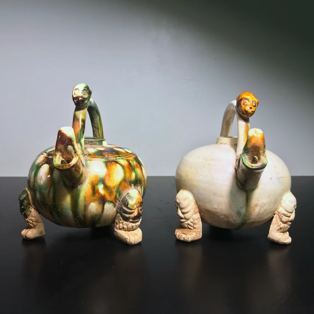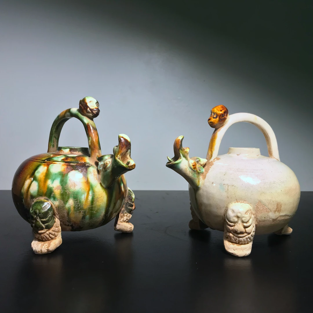 These two tripod Tang style sancai glazed pots come from the Chew family collection. The short round pots have three figural feet, a mouth form spout, and a monkey head on the handle. 4″ x 4″ x 4″
