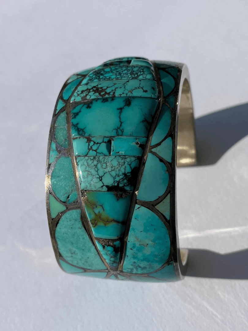 This cuff features turquoise from the Kingman and Fox mines, and is made with Argentium silver by New Mexican master jeweler Danny Stewart. The piece is inspired by the artistry of ancient Egypt and the art deco movement. It measures 5 inches with an opening of 1.25 inches and 1.25 inches in width.