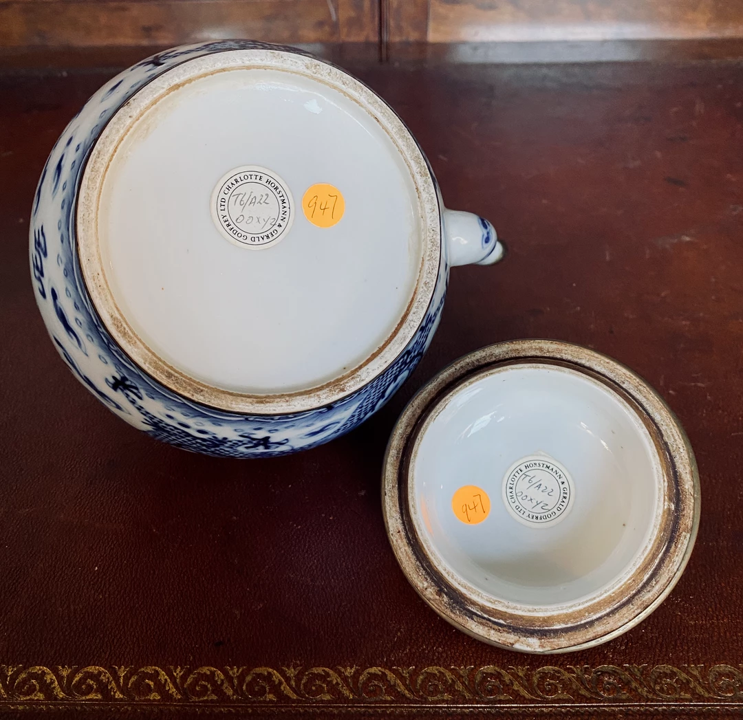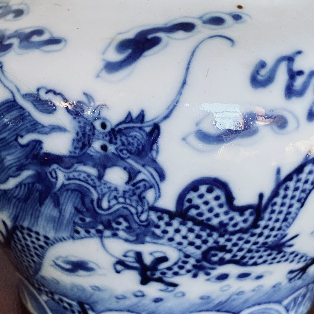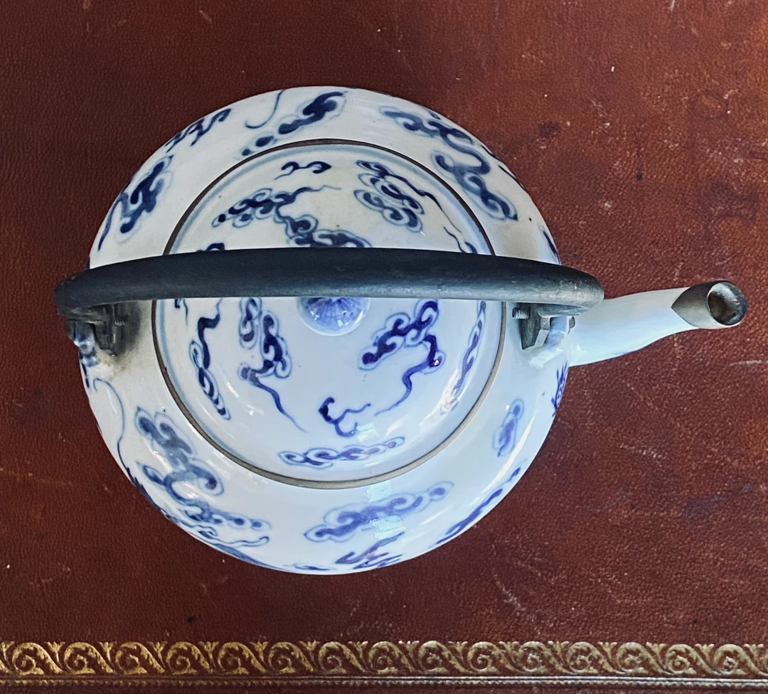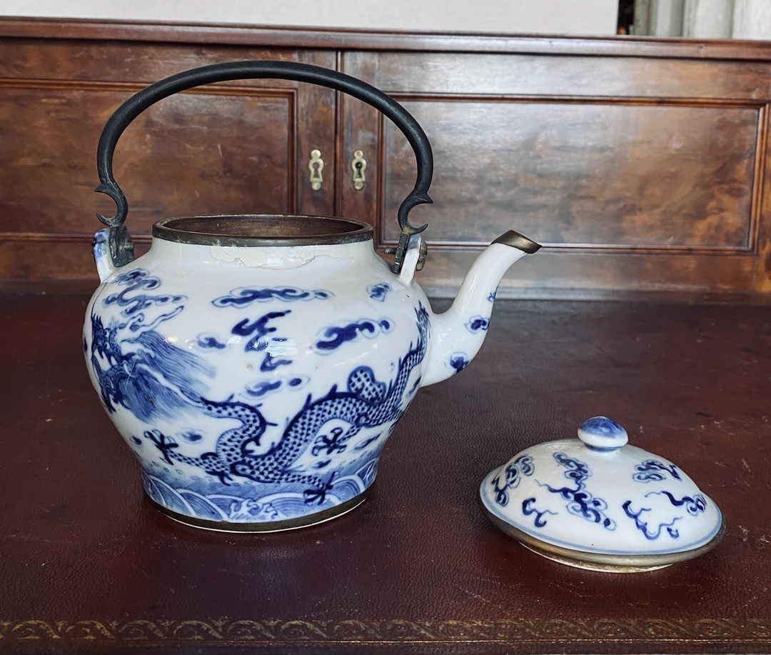 A Chinese blue and white dragons tea pot and lid with metal mounts from the late Qing Dynasty. The pot has a globular body, two moulded rings to the shoulders where the C-shaped metal handle is inserted, truncated-conical spout with metal end, and a domed lid with circular finial. The body of the pot is hand-painted with dragons amidst clouds and flames.Â