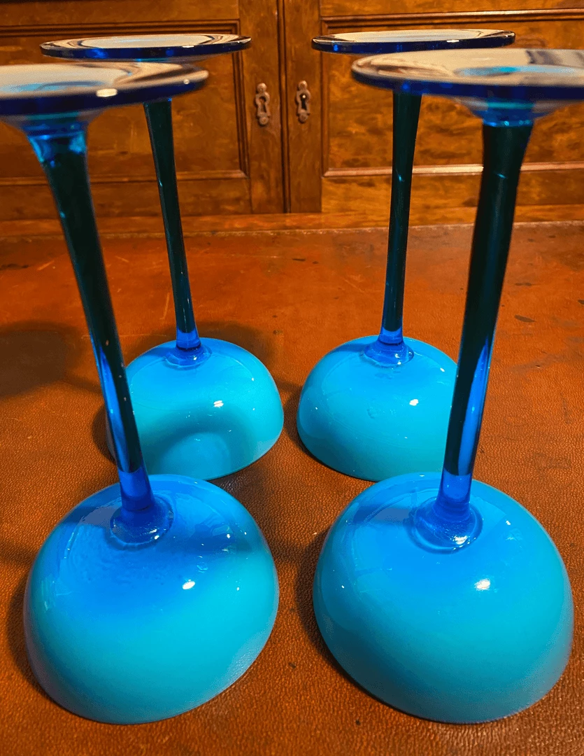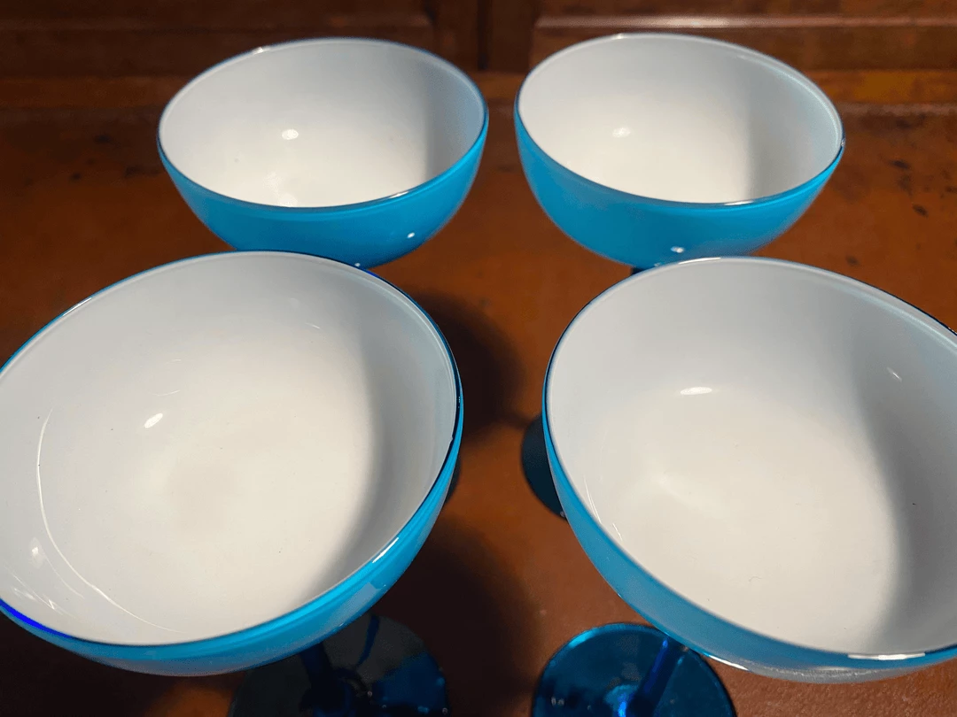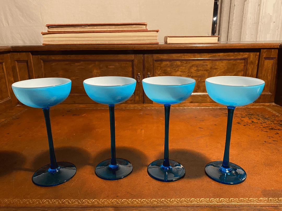 A set of four very tall stemmed champagne coupes by Carlo Moretti, Murano Italy. One of the innovators in Murano glass, Moretti was born on the island and founded his company with his brother Giovanni in 1958. One of the most loved designs is this tall champagne coupe with the milky white interior and blue exterior.