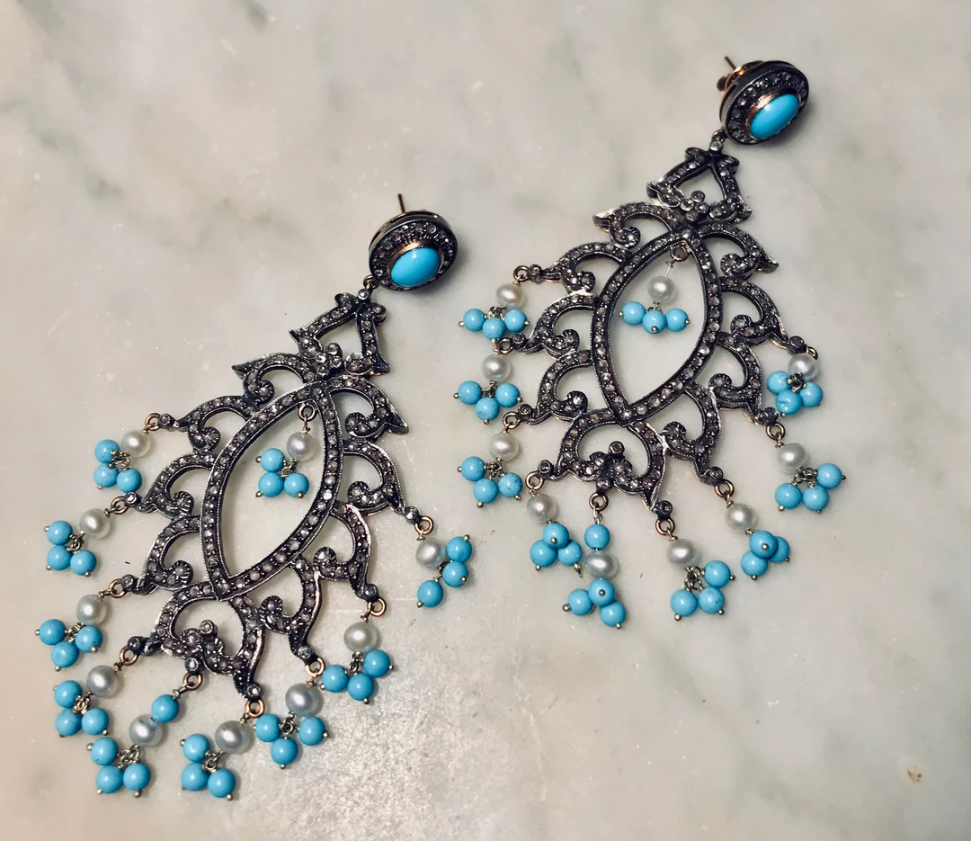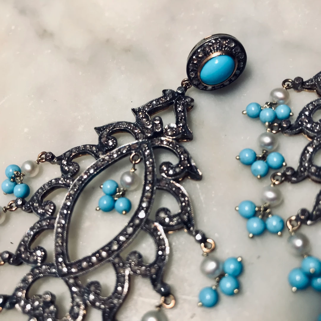 14K gold and 925 silver with over 3 carats of diamonds featuring seed pearls and turquoise drops. The oxidized treatment shows off the diamonds as well as the semi-precious gems. 30 grams. 3.5 inches by 2 inches.