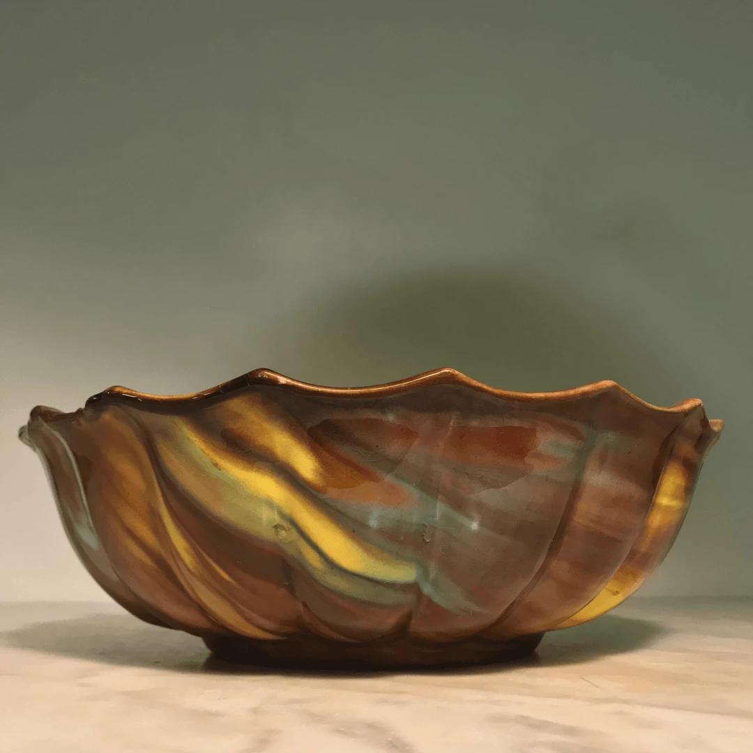 A set of two Edwardian era majolica nesting bowls circa 1905. in richly colored mixed glazes, the bowls have a ribbed design and one sits nicely inside of the other. The largest bowl measures 10 inches wide and 3 1/4 tall.