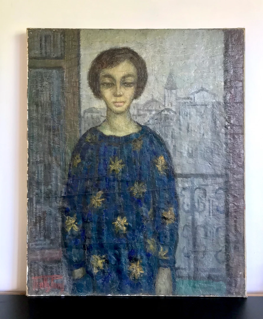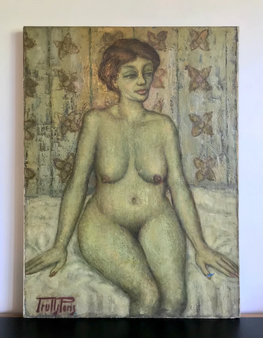 Two oil paintings on canvas by Spanish painter Antoni Trulls Pons. Each canvas has heavy craquelure due to age and the artists generous use of the medium. The portraits are of the same lady in dress and undress. Each canvas measures 39 inches by 32 inches and come from the estate of a Scarsdale NY family.