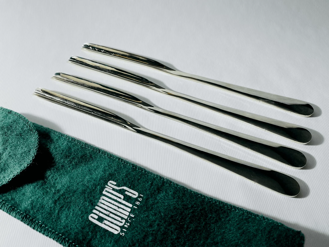 A tool that was very popular in the 18th century and now rarely seen, yet remarkably useful. The slender scooped spoon allows one to go after that lovely marrow (sorry vegans) inside of osso bucco or similar boney cuts. A set of four in a felt bag from GUMP’S in San Francisco.