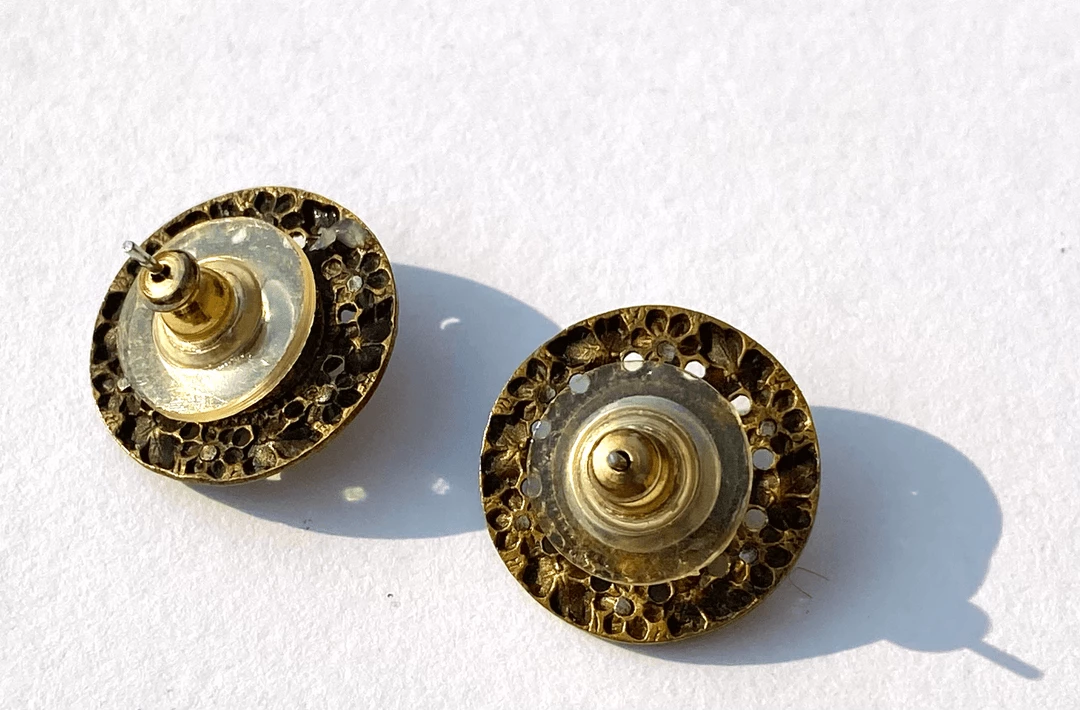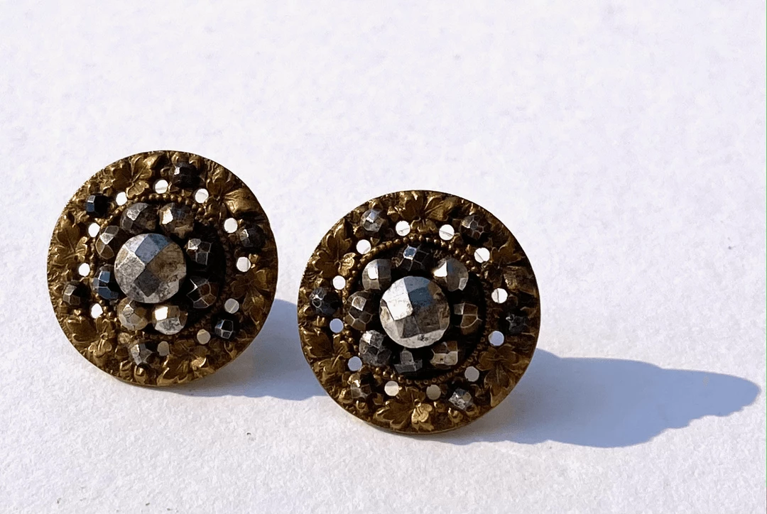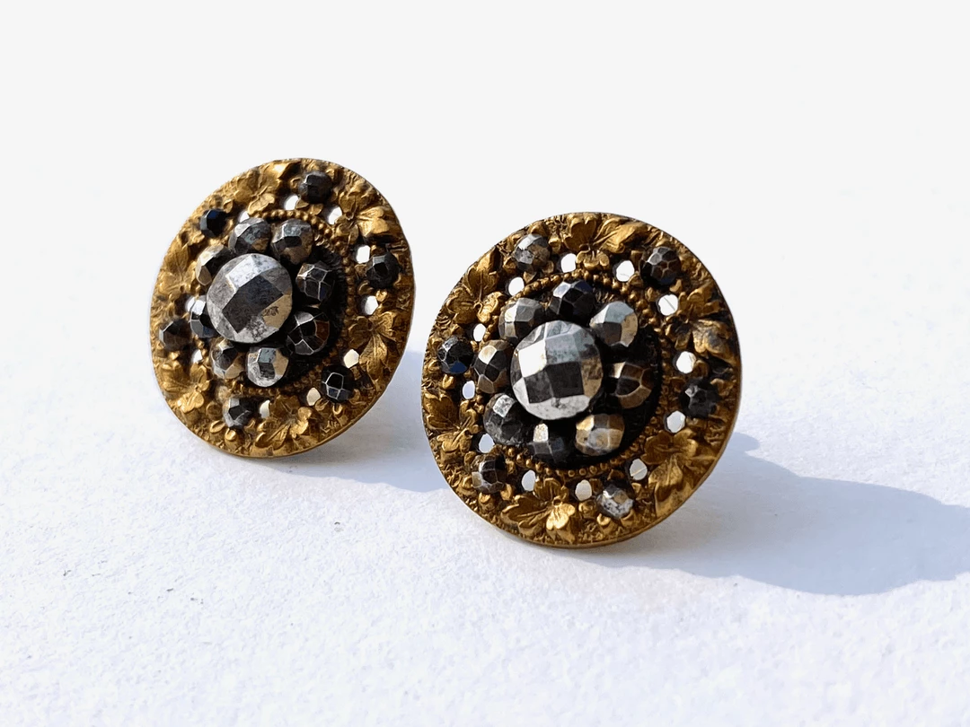 A combination of brass and steel with a floral vine motif, this pair of cut-steel earrings may have been buttons originally, as the dazzling adornment was also worn on coats and vests. Note the fourth photo.Â
