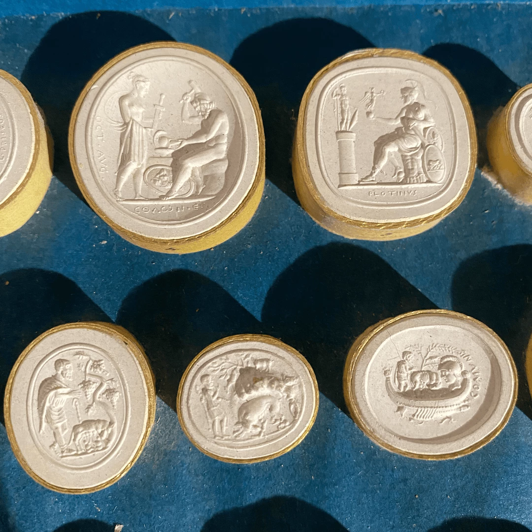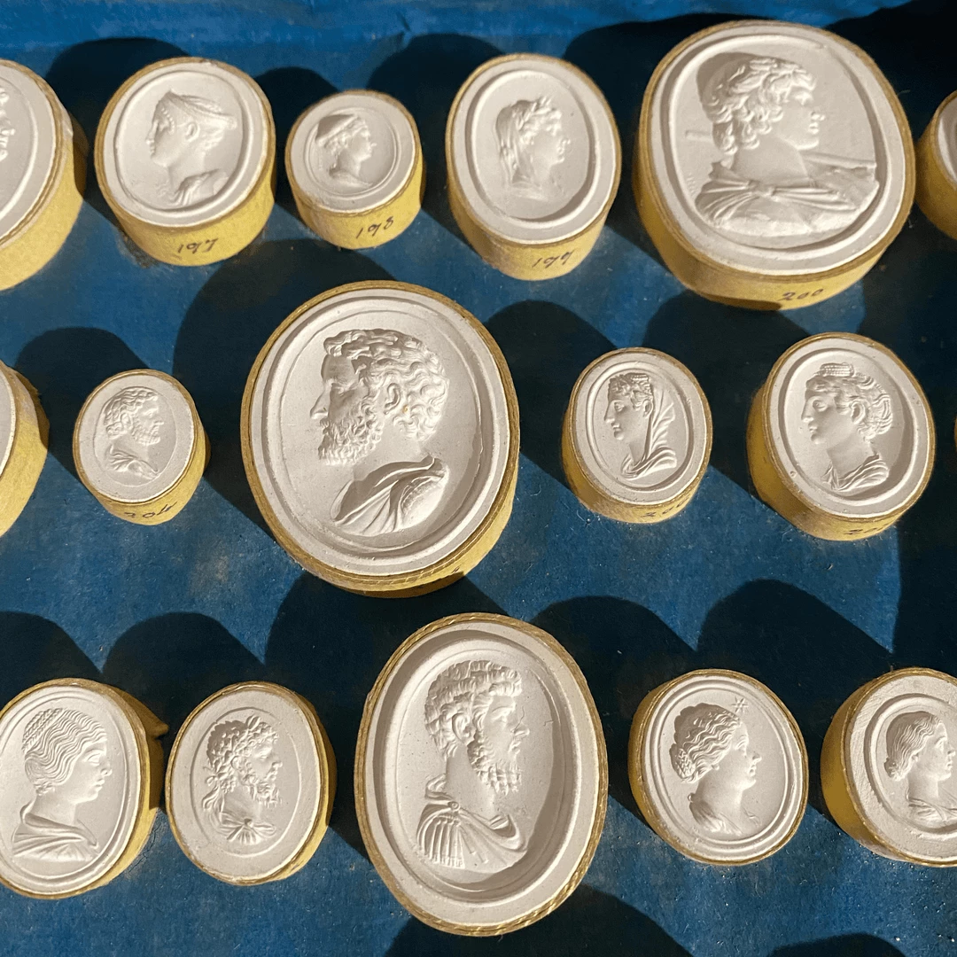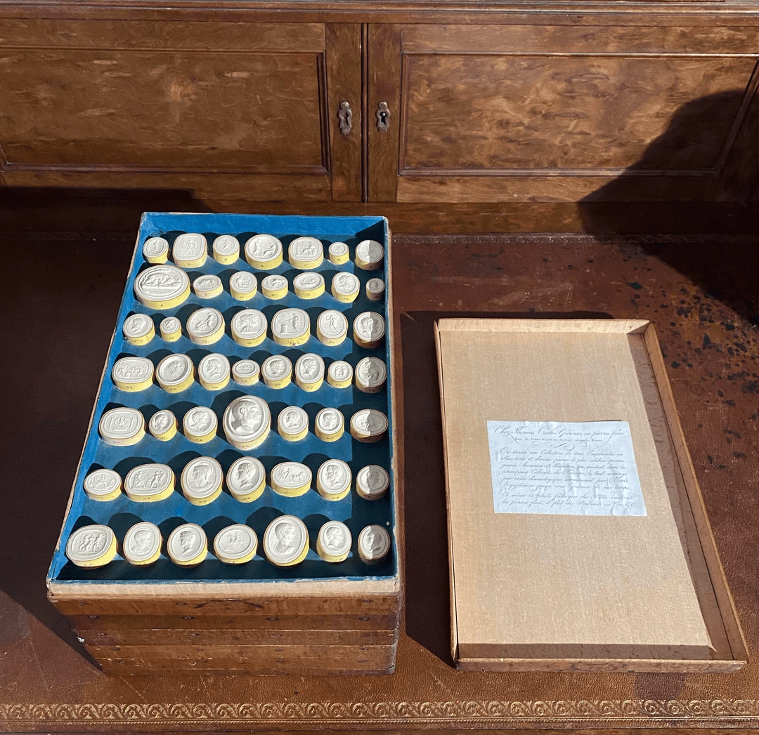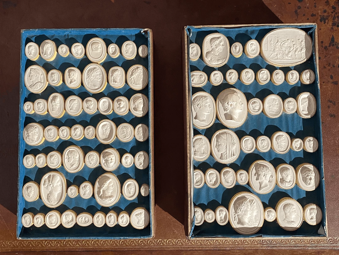 One of the more esteemed makers of impronte was Thomas Cade, whose father was a graveur of gemstones. This cased collection of 300 plaster intaglios is presented in six numbered wooden trays which stack neatly. The top tray has a cover with a label intact on the inside noting the maker.