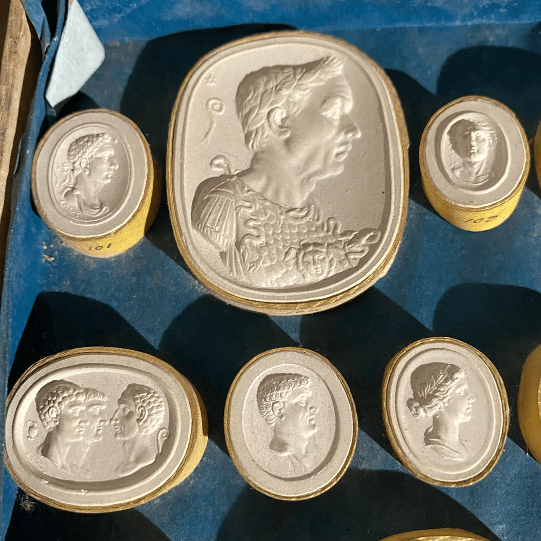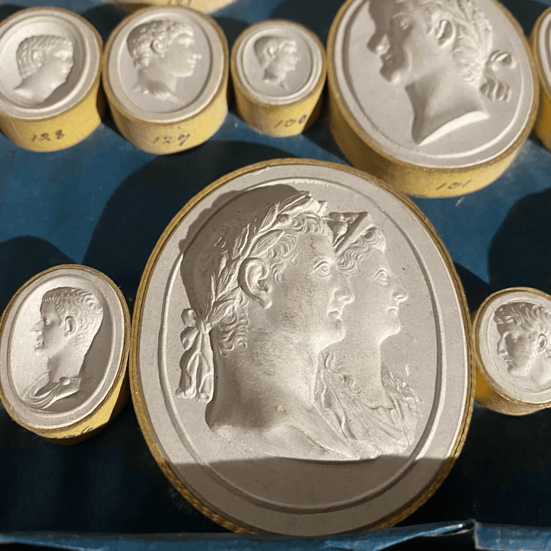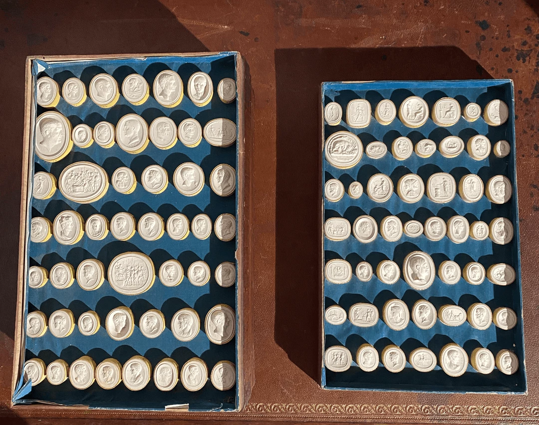 One of the more esteemed makers of impronte was Thomas Cade, whose father was a graveur of gemstones. This cased collection of 300 plaster intaglios is presented in six numbered wooden trays which stack neatly. The top tray has a cover with a label intact on the inside noting the maker.
