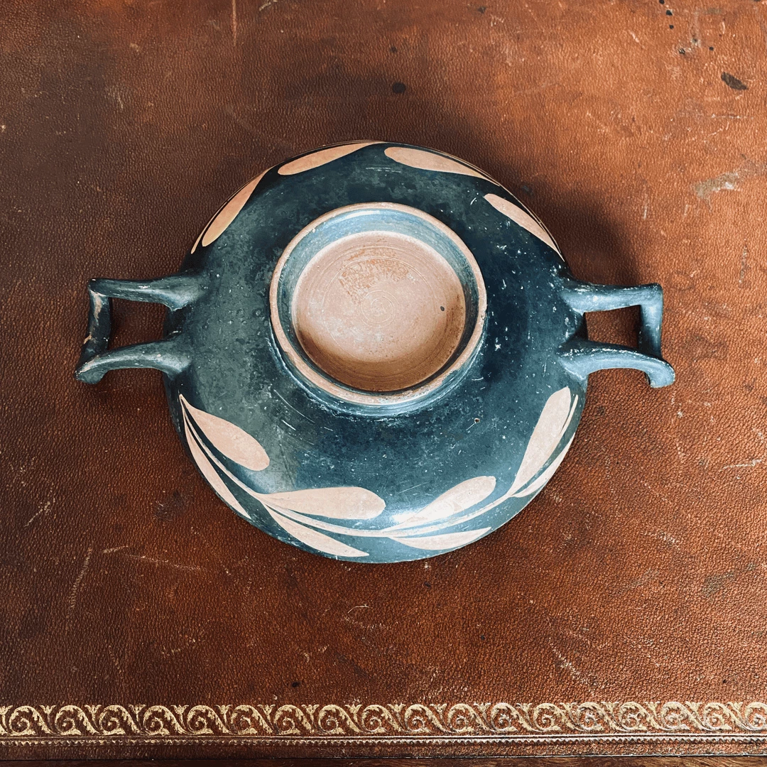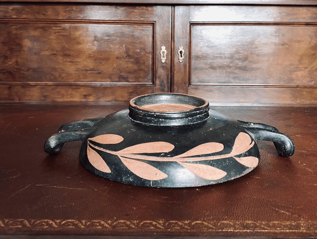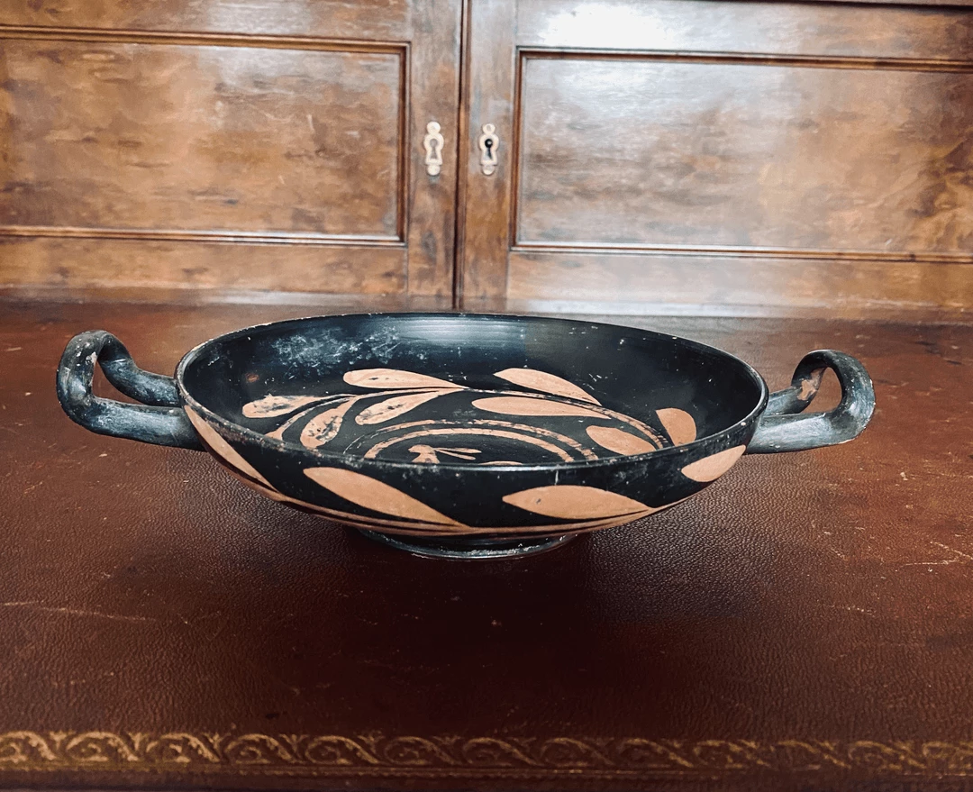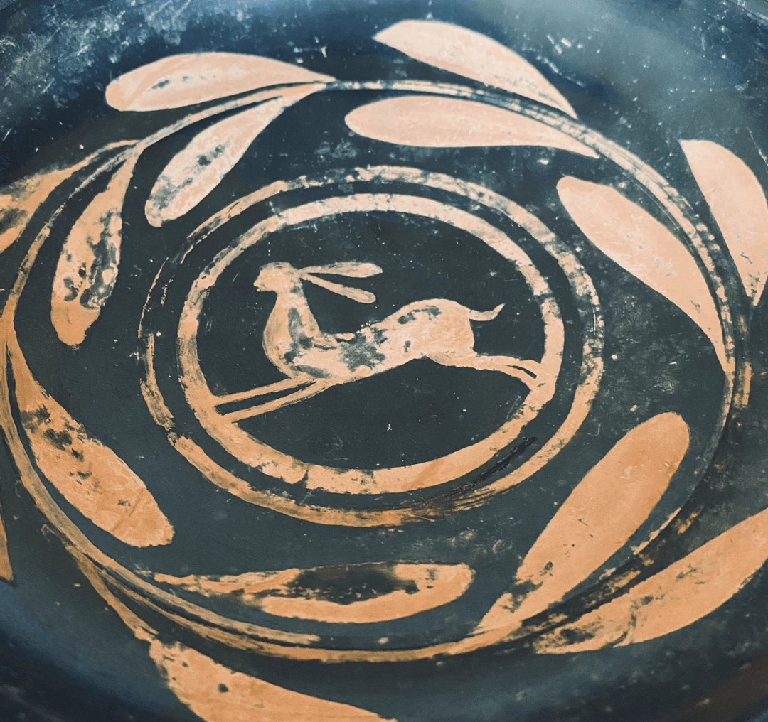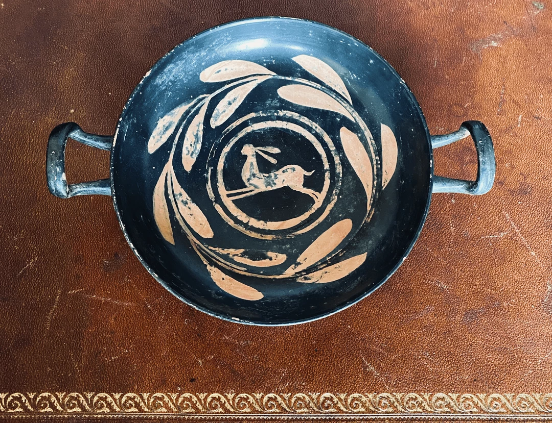 A Greek Kylix drinking vessel dating from 450 B.C. The kylix was used for drinking wine, and would likely have been a romantic gift from a young man to a young lady. The hare is a symbol of vitality, fertility, and desire, and was assocaited with Aphrodite. The laurel leaves were worn by Apollo as a demonstration of his love for Daphne. They also symbolize victory in sport or mastery of the arts. 2 inches by 9 inches.