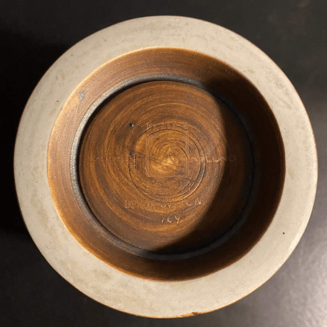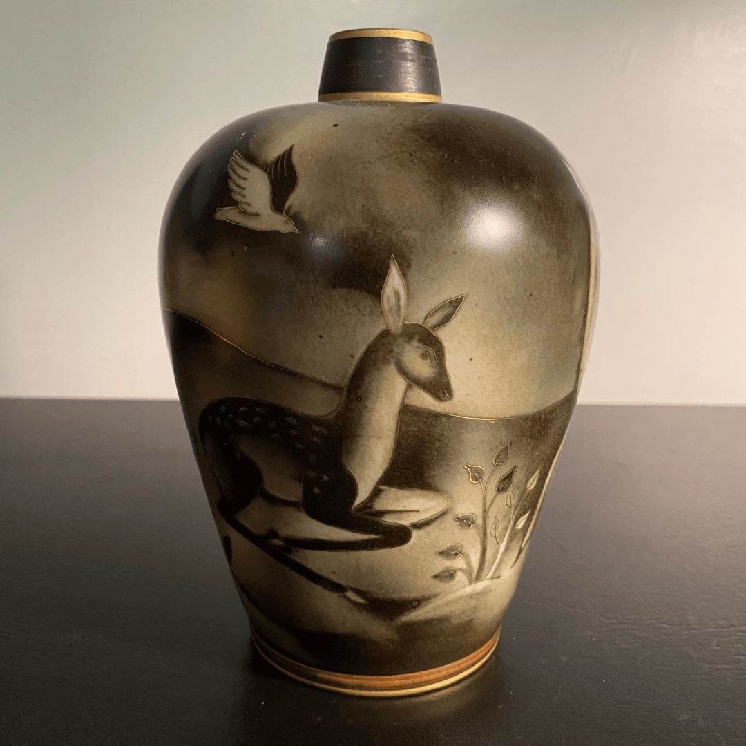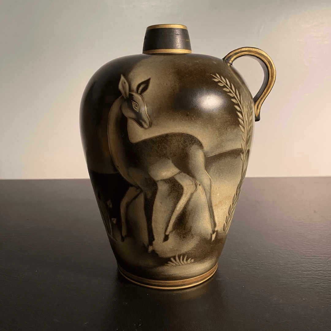 Gunnar Nylund created the flambé series for Rörstrand Sweden in 1932. The collection features urns, vessels, and bowls with mythological imagery, neoclassical, and art deco motifs This jug comes from the estate of a Massachusets Professor and is a wonderful example of the art deco-influenced work created by Nylund. The flambé jug is in excellent condition and measures 8″ in height and 5″ in diameter.