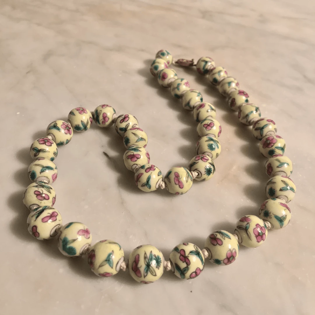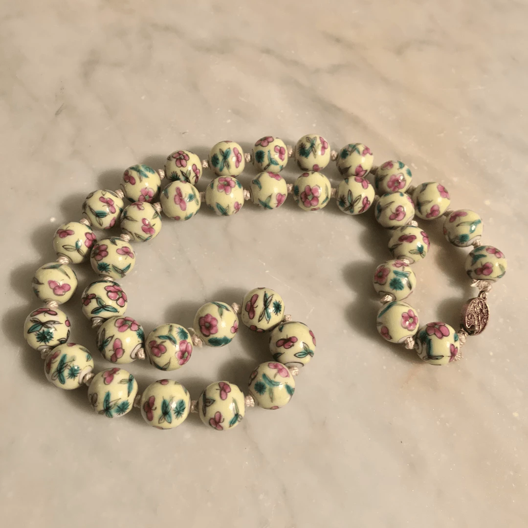 A 24 inch long hand-knotted necklace with hand-painted porcelain beads and a filigree clasp. Early to mid 20th century.