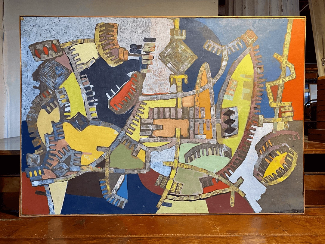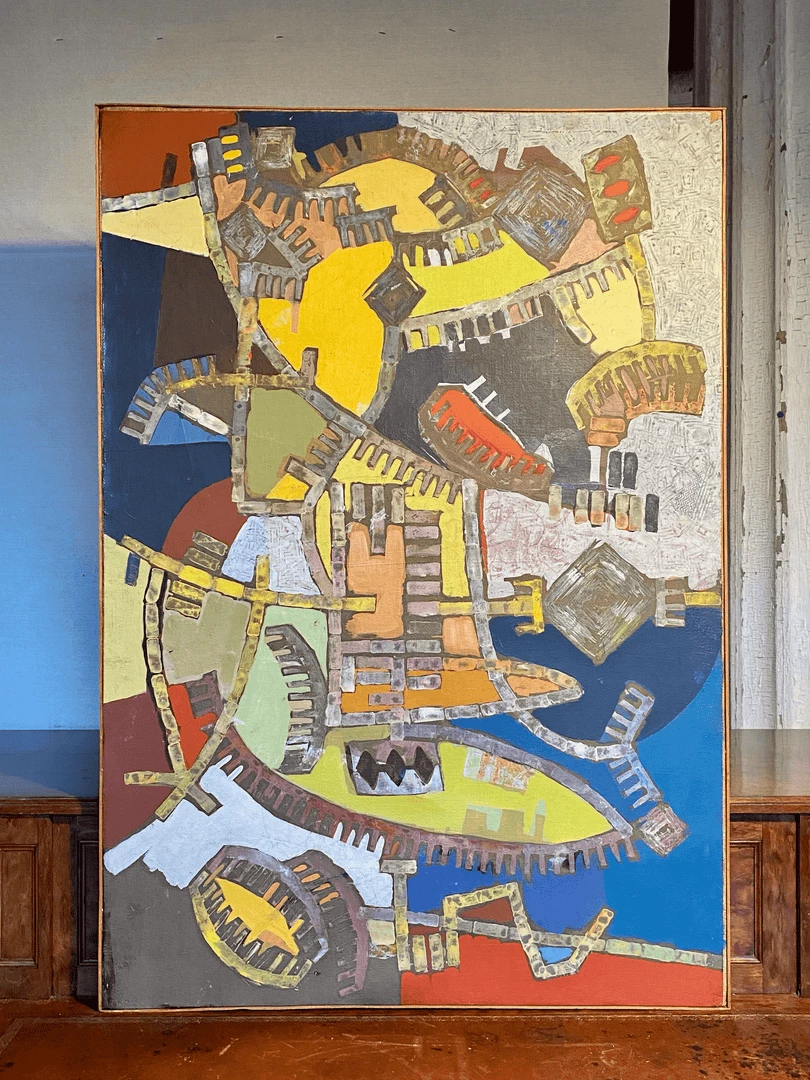 This is one of my favorite pieces in the collection. There is something about the palette and the busy yet ordered chaos of this work that draws me in. The work is so deliberate, and clear in its vocabulary. And like Italian, I don’t speak or understand much, but with a visual feast like this, I don’t need to. The painting is an oil on paper laid to canvas. The canvas has a minimal wooden frame to finish the edges. 28″ x 40″ x 1″