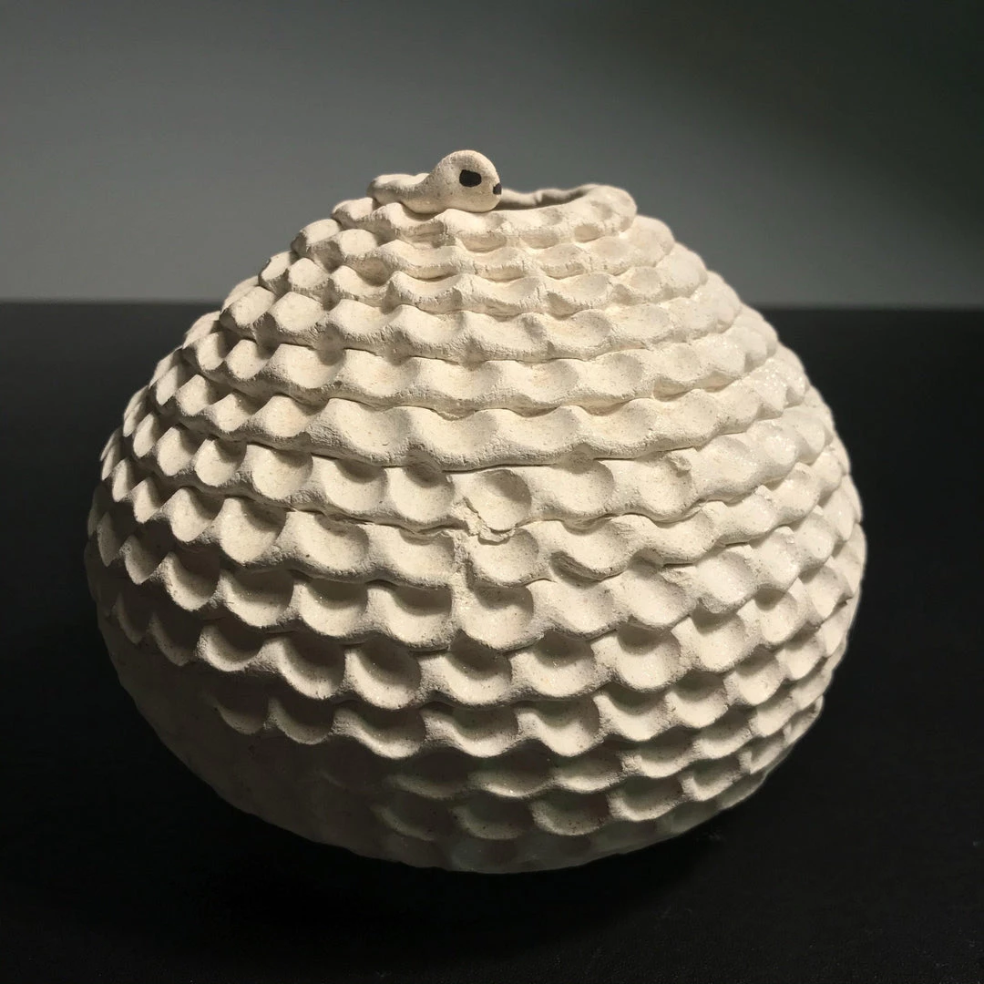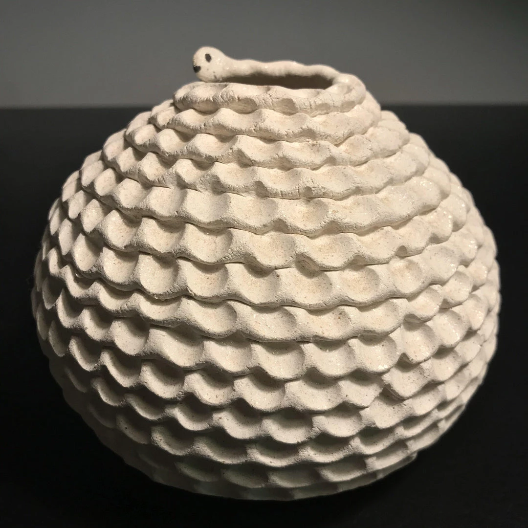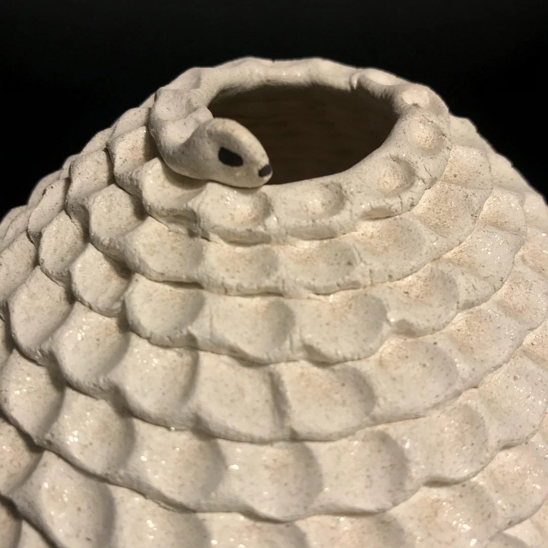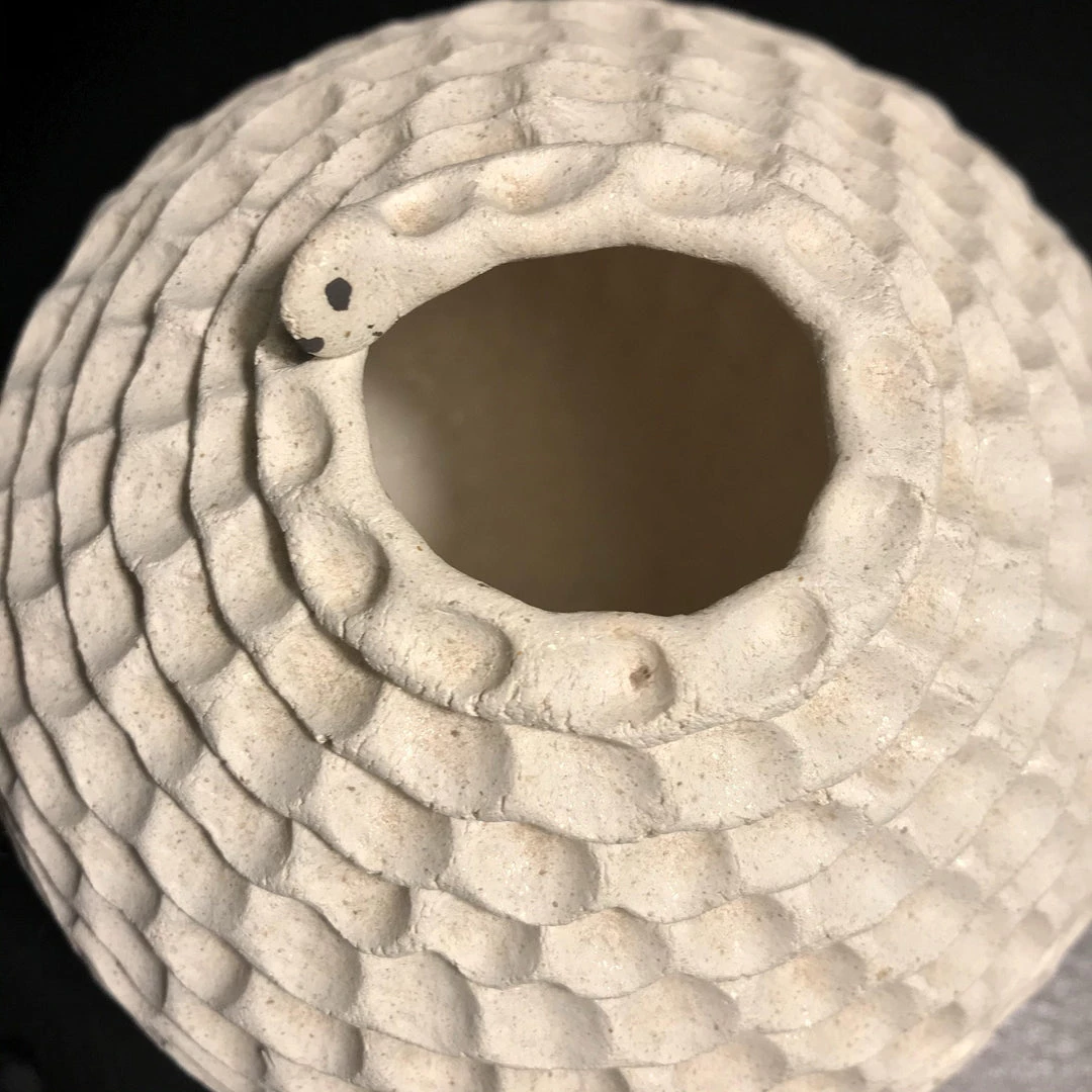 This pot is hand-coiled and pinched in white clay to represent a snake. It is signed and measures 5 inches by 5 inches.Â