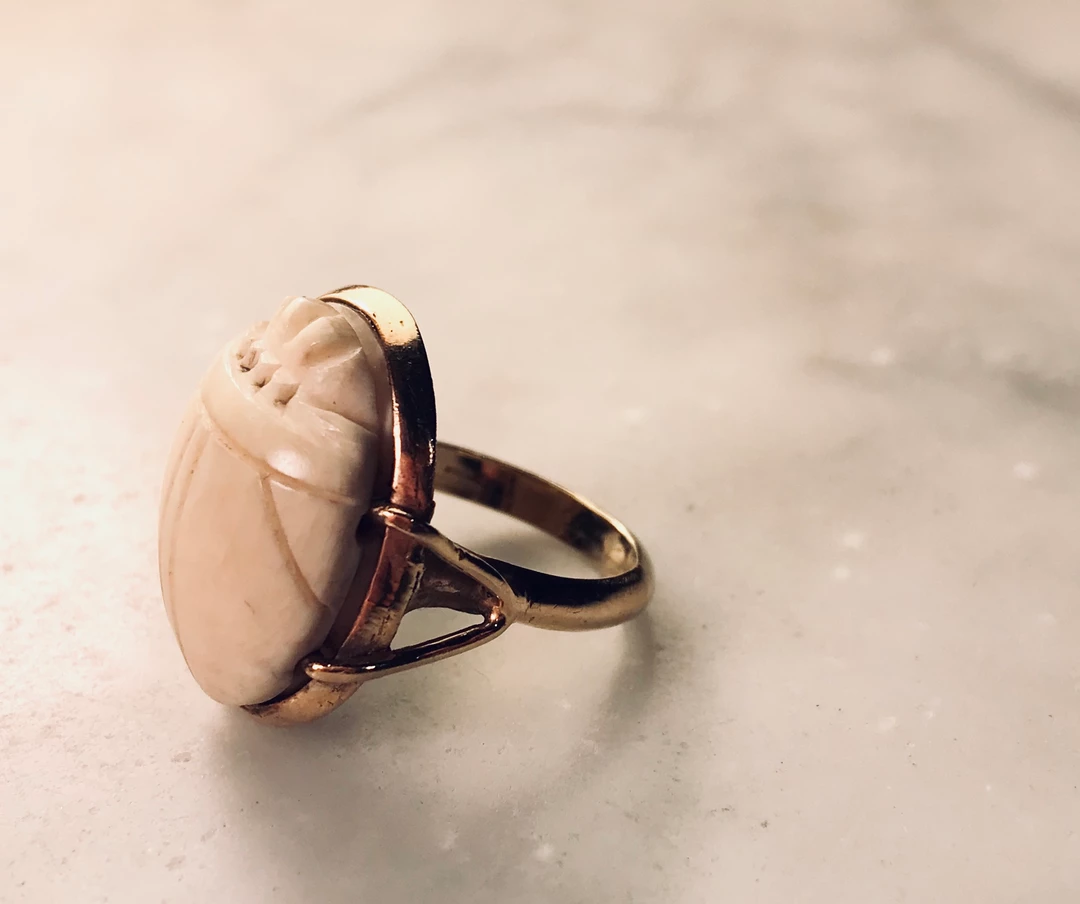 A natural carved scarab in a modern Egyptian 14K gold setting. The scarab is a symbol of wealth, rebirth and protection and was associated with Ra, God of the Sun, in ancient Egypt. Size 7.75