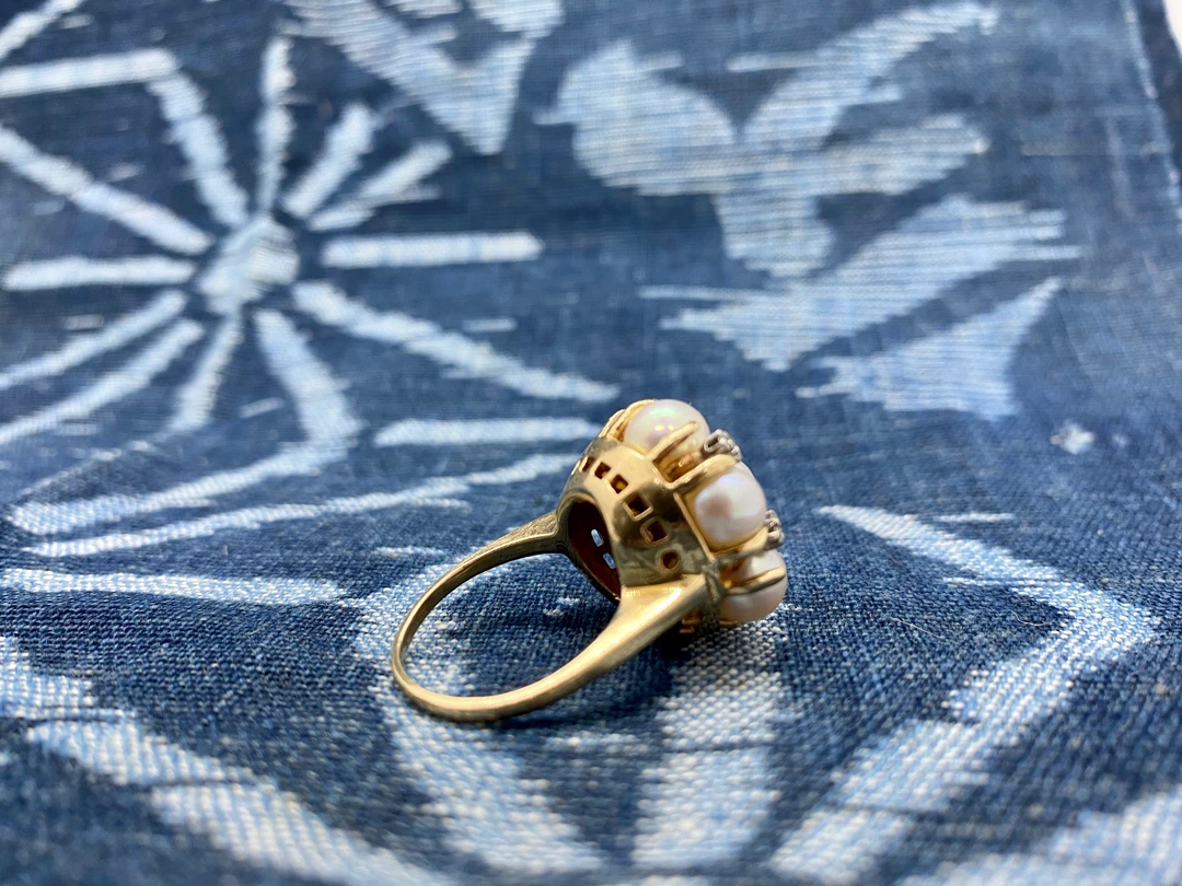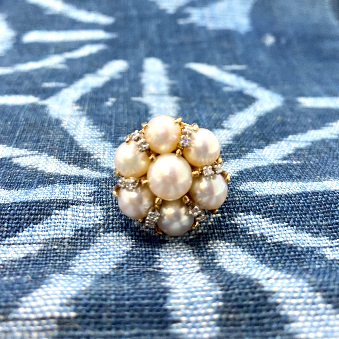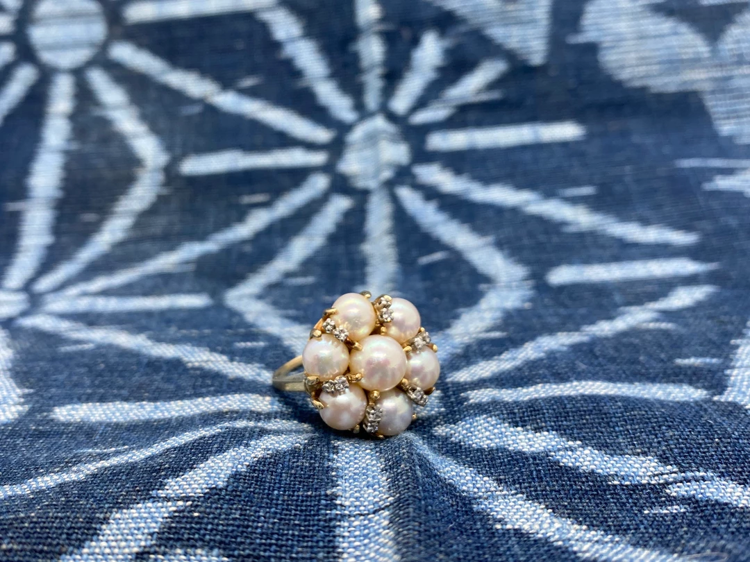 A crown of cultured pearls in a 14k setting highlighted with a dozen diamonds creates a stunning display full of lustre and shine. Size 5.
