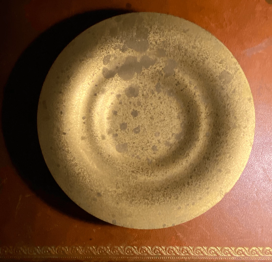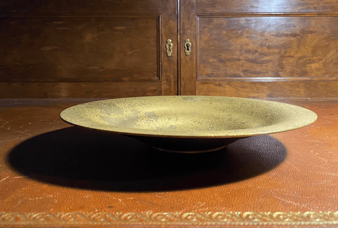 Louis Comfort Tiffany was deeply influenced by the ancient glass he had seen overseas in London. From his Tiffany Furnaces factory in Queens, New York, he perfected his methods for Favrile (derived from the Old English word fabrile meaning hand-wrought) glass and gilt bronze. This is a shallow bowl in favrile bronze. 9 inches by 1.75 inches. Unmarked.