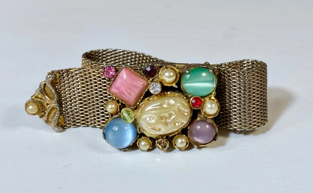 Costume jewelry, in my humble opinion, is best when it is playful and a bit ridiculous. This wonderful vintage mesh bracelet has been embellished and finished with a mix of Belle Epoque and Mod styles. All great fashion has a mix of costume and fantasy. Name one fashion icon that has not embraced this truth.