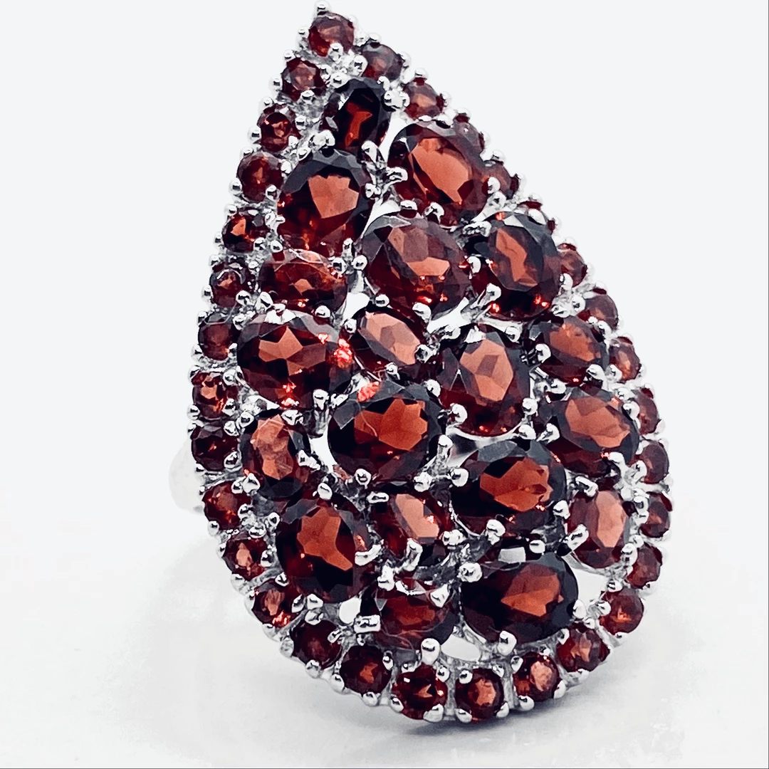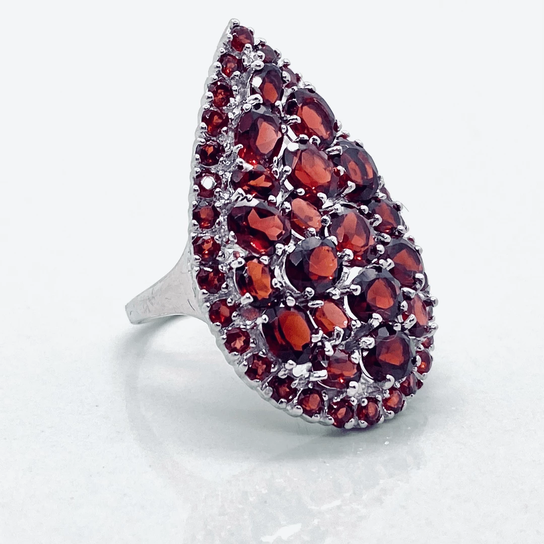 Over fifty natural red-orange Mozambique garnets are set in 14K white gold plated sterling silver, creating this stunning tear-drop statement ring. The stones are natural and untreated, making them all the more special. Size 8.5.