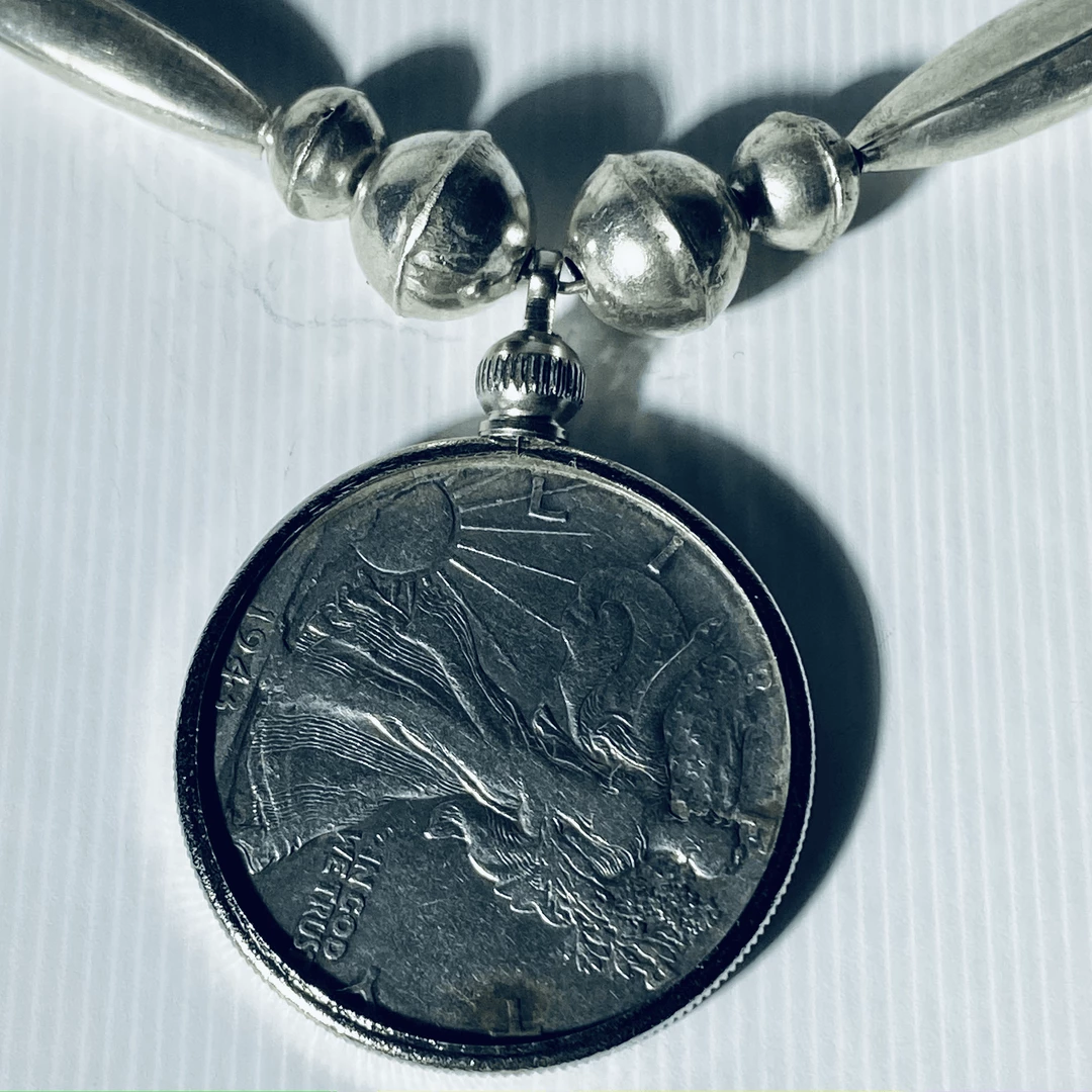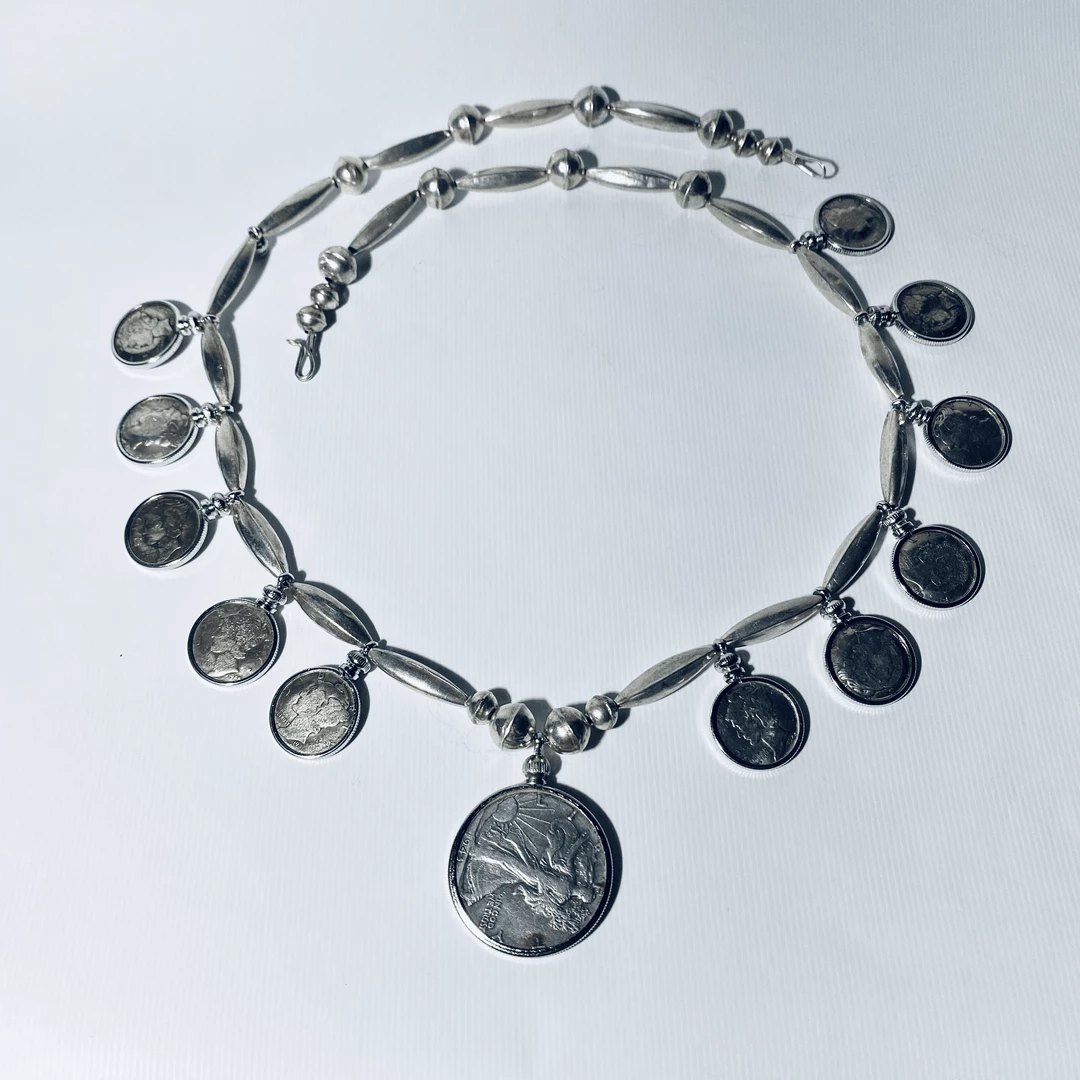This is a fantastic old pawn Navajo necklace made from sterling silver beads and featuring silver Mercury Dimes and a silver Walking Liberty half dollar coin. These coins were minted between 1916 and 1947 and are 90 percent silver with 10 percent copper. The necklace is 24 inches and the Walking Liberty pendant measures 1 3/4 inches by 1 1/4 inches. This piece is surprisingly lightweight. 75 g.