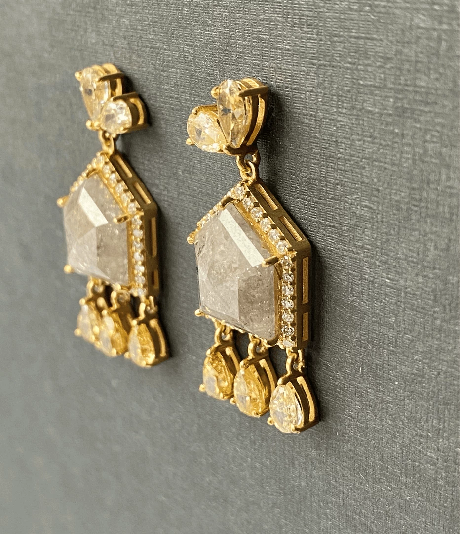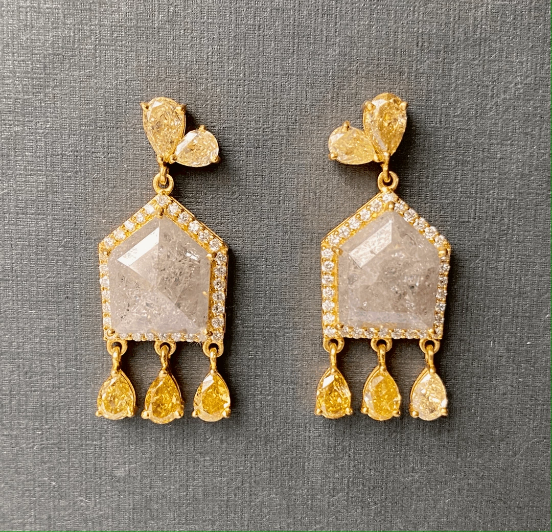 AÂ 3.5 carat grey bullet-cut diamond set in 18K yellow gold, surrounded by round cut diamonds and five teardrop yellow diamonds. They are 1.25″ in length.