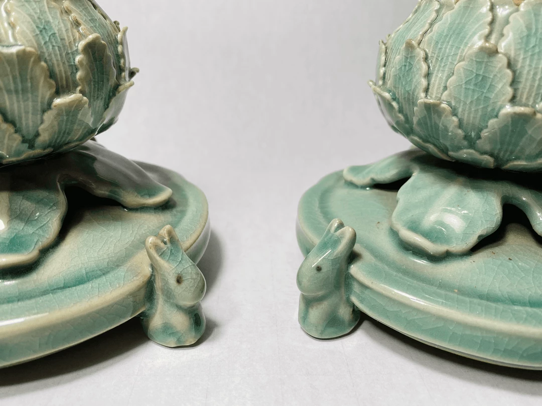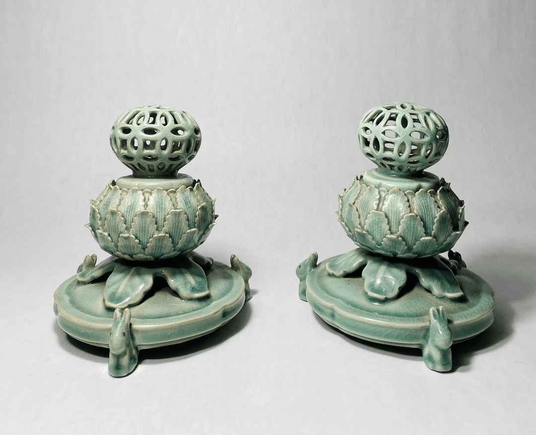 A pair of Korean celadon lotus form censers, with reticulated orb tops. The censers sit on a circular base with three rabbit form feet. The origin of the lotus form celadon censer dates back to the 12th century. These are likely 19th or early 20th century. 6 1/2 inches tall and 6 inches wide.