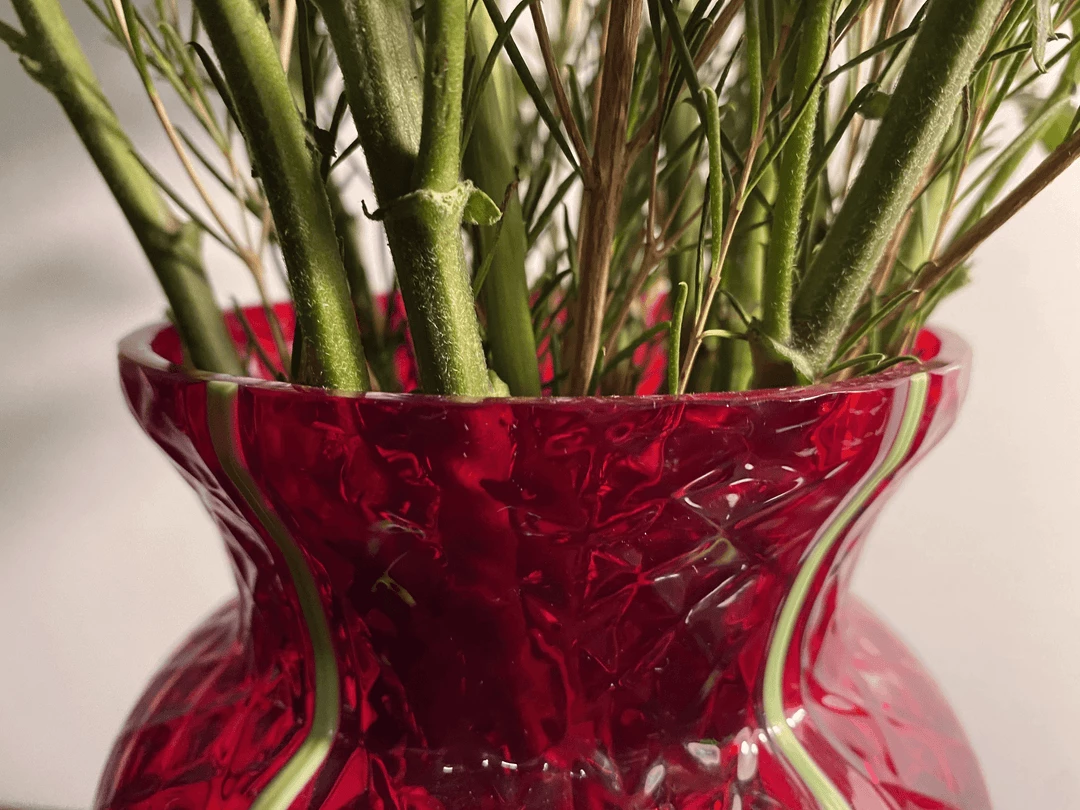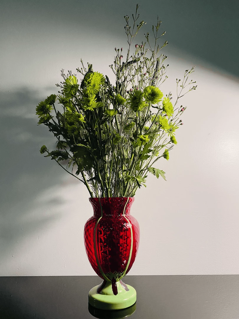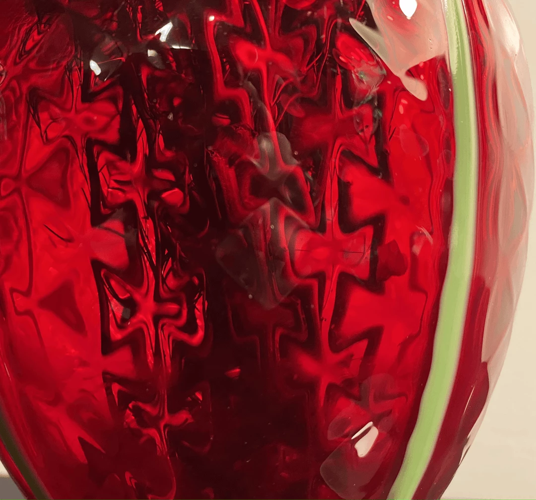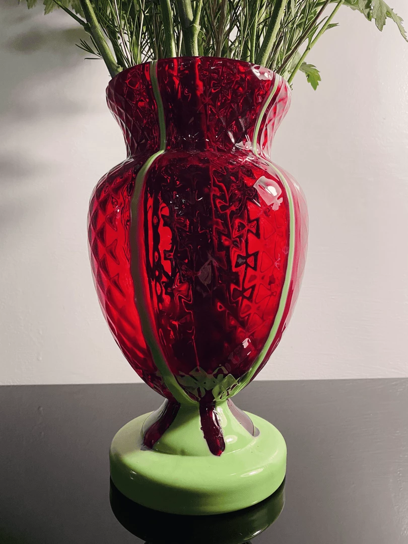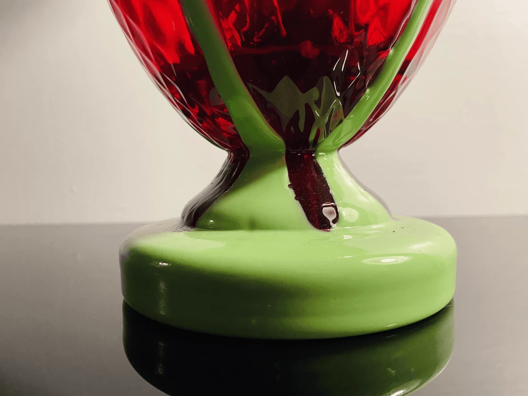 This piece has an opaque bright green base that travels up its deep red translucent body. A classic Grecian urn shape in anything but classic colors! 9 1/2 inches by 4 1/2 inches.Â