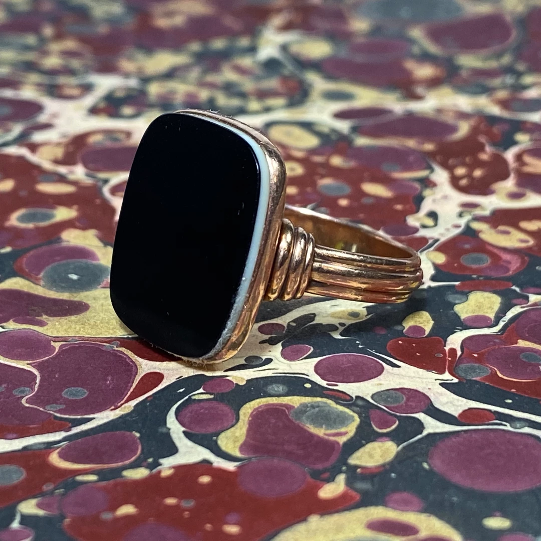 An art deco band of 10K rose gold, features a clean surface of black and white sardonyx. The signet ring would traditionally be carved to reveal the white chalcedony underneath. It is elegant as it is, but can certainly carry your coat of arms, initials, spirit animal, etcetera. The ring is a size 10.