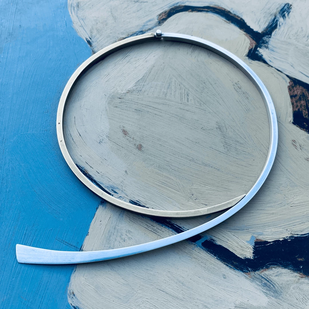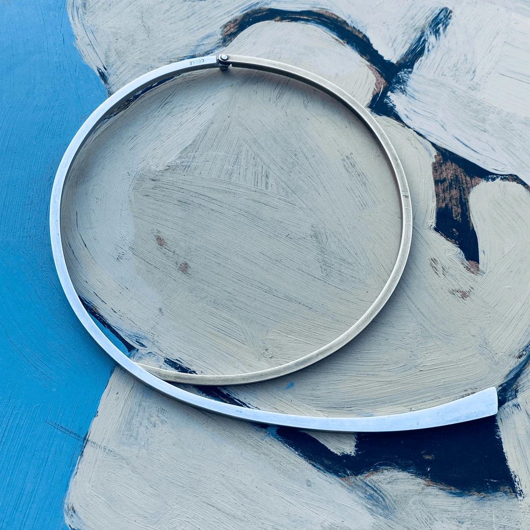 At the age of 93, the modernist Betty Cooke is a living legend in the art world. Her exploration of the circle and the line over the last seventy years has pushed the boundaries of minimalism and adornment. This striking choker is made of sterling silver and brass, with a simple hinge and closure. The necklace is signed with an inner circumference of thirteen inches.