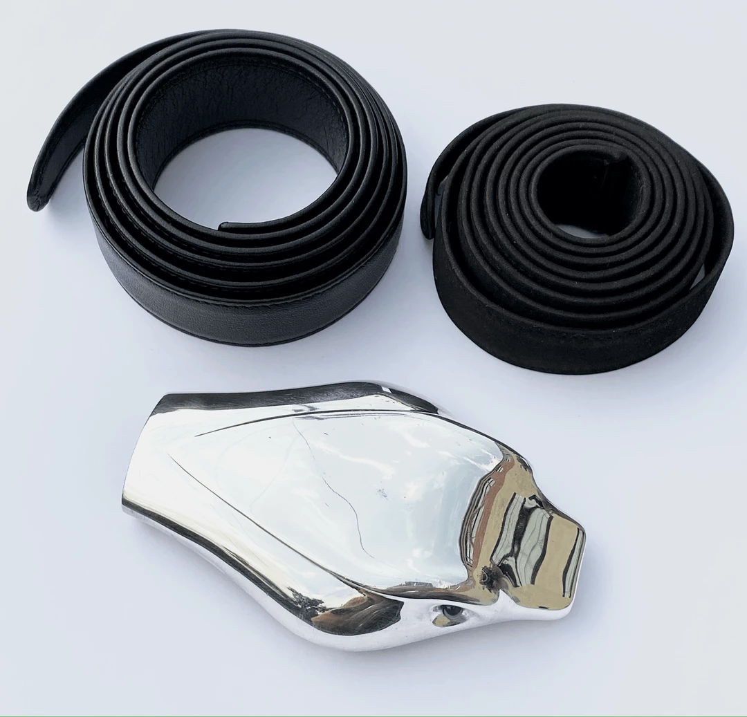 Designed in the 1970’s, the sterling silver snake belt buckle was one of the early designs for Tiffany & Co. Increasingly rare, the design has been updated with blue star sapphires for eyes. Along with the sterling buckle are two belts in black leather and black suede. All in a classic blue Tiffany & Co. box. The buckle measures 3″ x 2″ and each belt is 43″ in length.Â