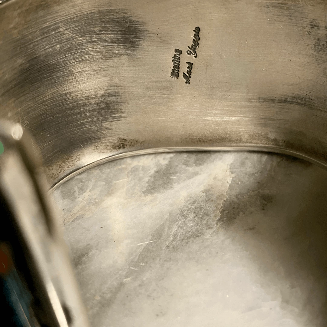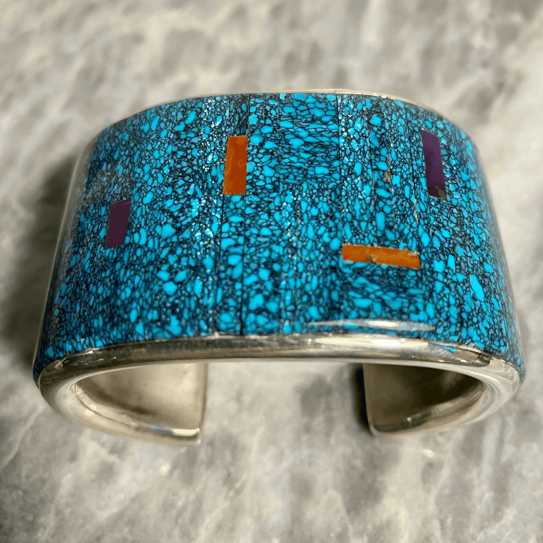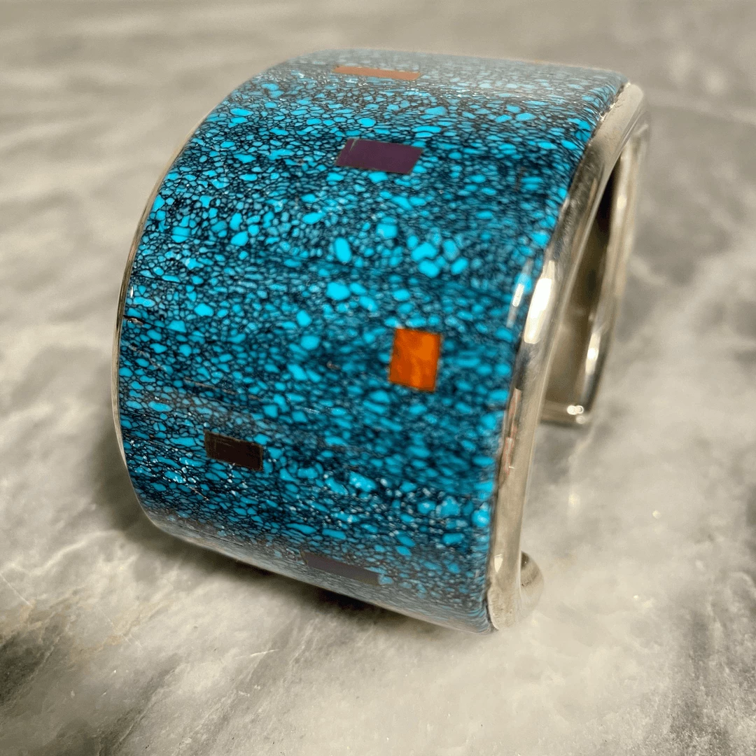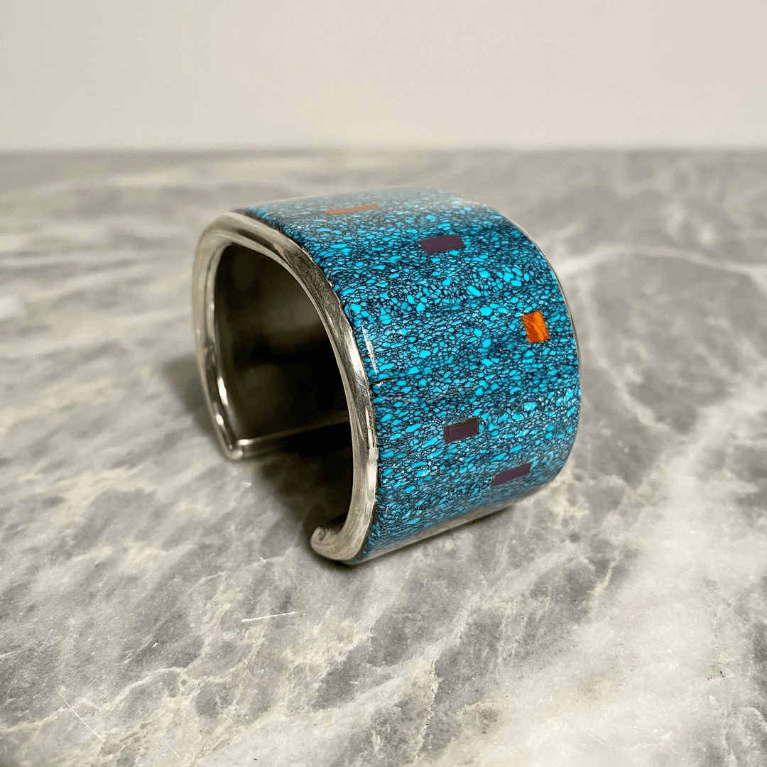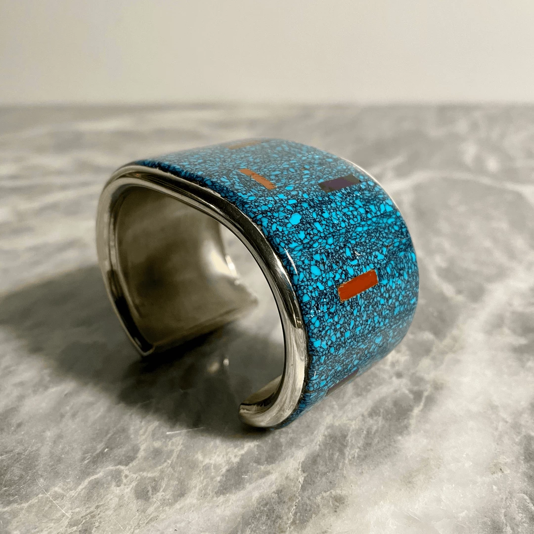 Modern sterling silver cuff with micro mosaic of turquoise, coral, and lapis by Navajo First Nation artist Mark Yazzie. This is a very special piece and is signed by Mark Yazzie. Bracelet: 5.5″ inner, 1.25″ gap, 6.75″ total, 1.5″ face width.