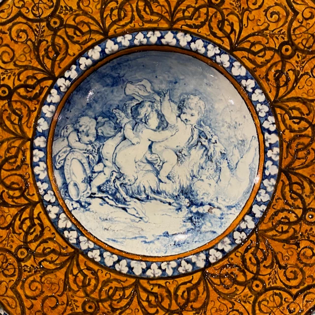 A beautiful porcelain charger from french porcelain house Sevres, which was established near Versailles in 1765. This is a more provincial design with hand-painted cherubs in the center, surround by black scrollwork on an orange ground. Framed beautifully in a hand-carved wooden surround showing both laurel and oak leaves.Â
