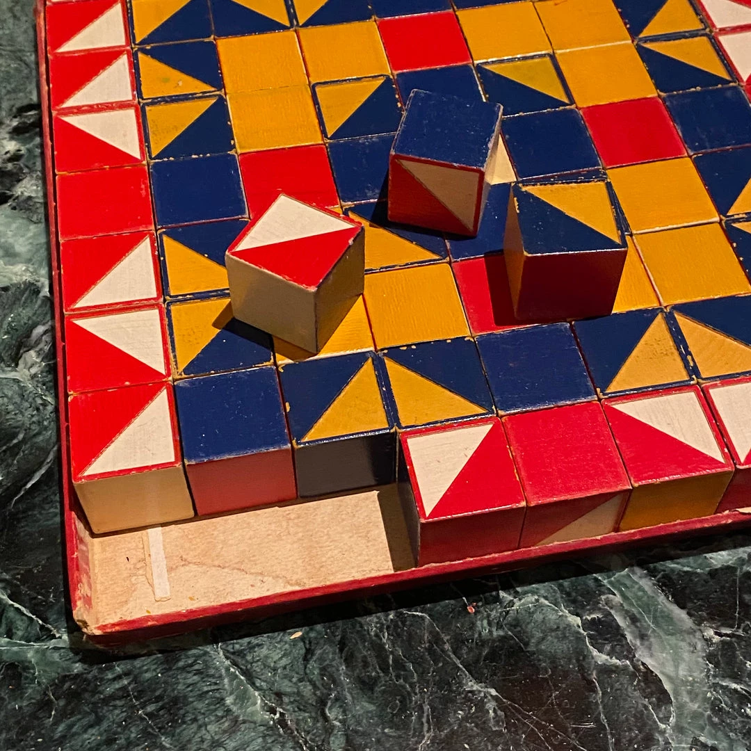 This set is circa 1930 and features 81 Color Cubes. They are used to create designs that can then be embossed via a rubbing or can be used as a planning tool for art projects, quilts, tiling, etc. I think they make a wonderful sculptural accessory to display.