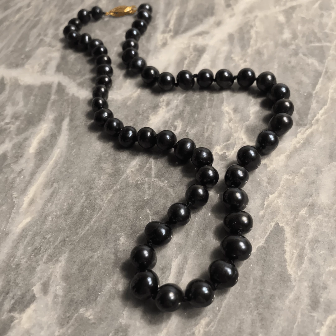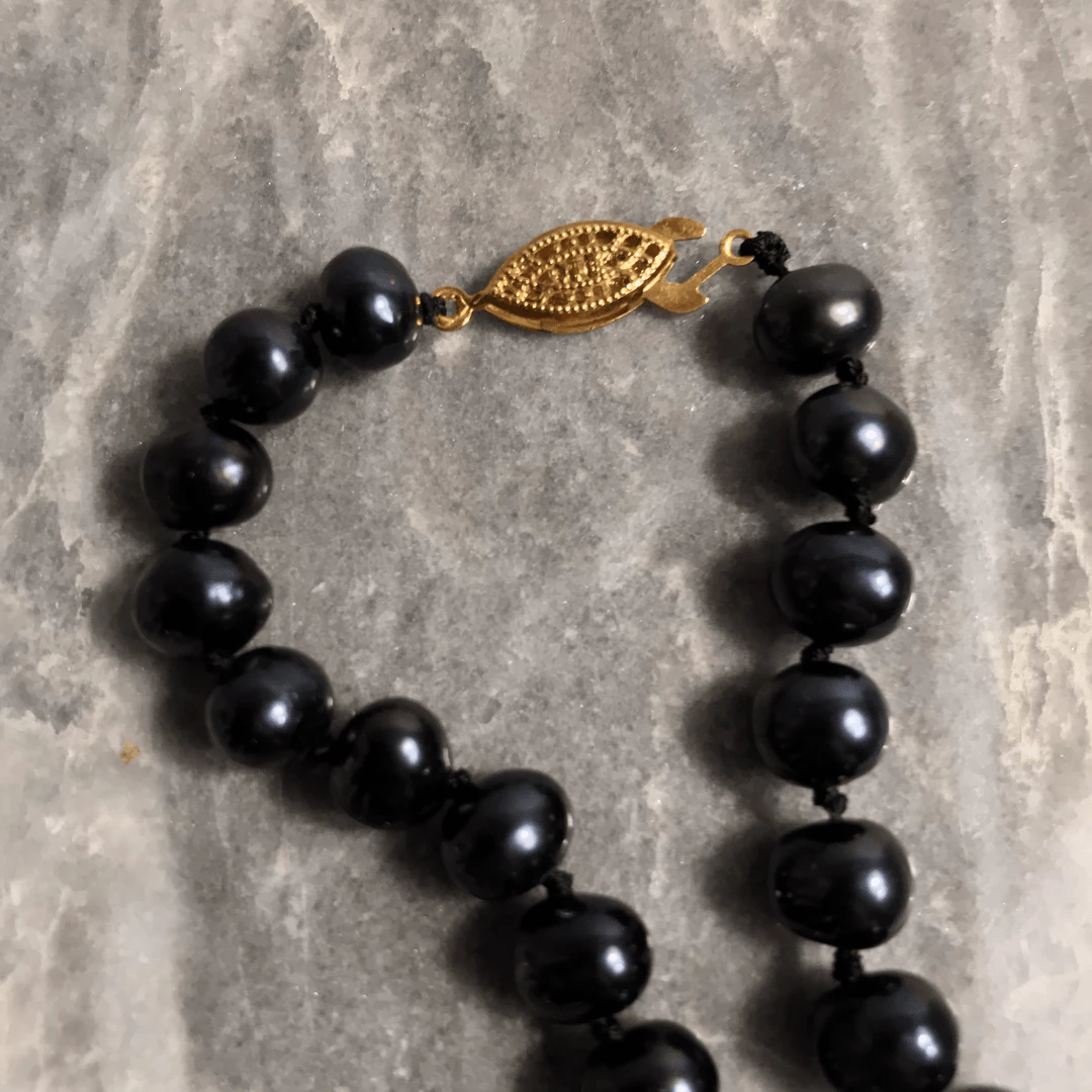 An exquisite Tahitian pearl circle-baroque necklace with a gorgeous dark color indicative of the South Sea. The strand features 53 hand-knotted black pearls, beautifully matched in size, with a deep rich inky blue and eggplant color.
