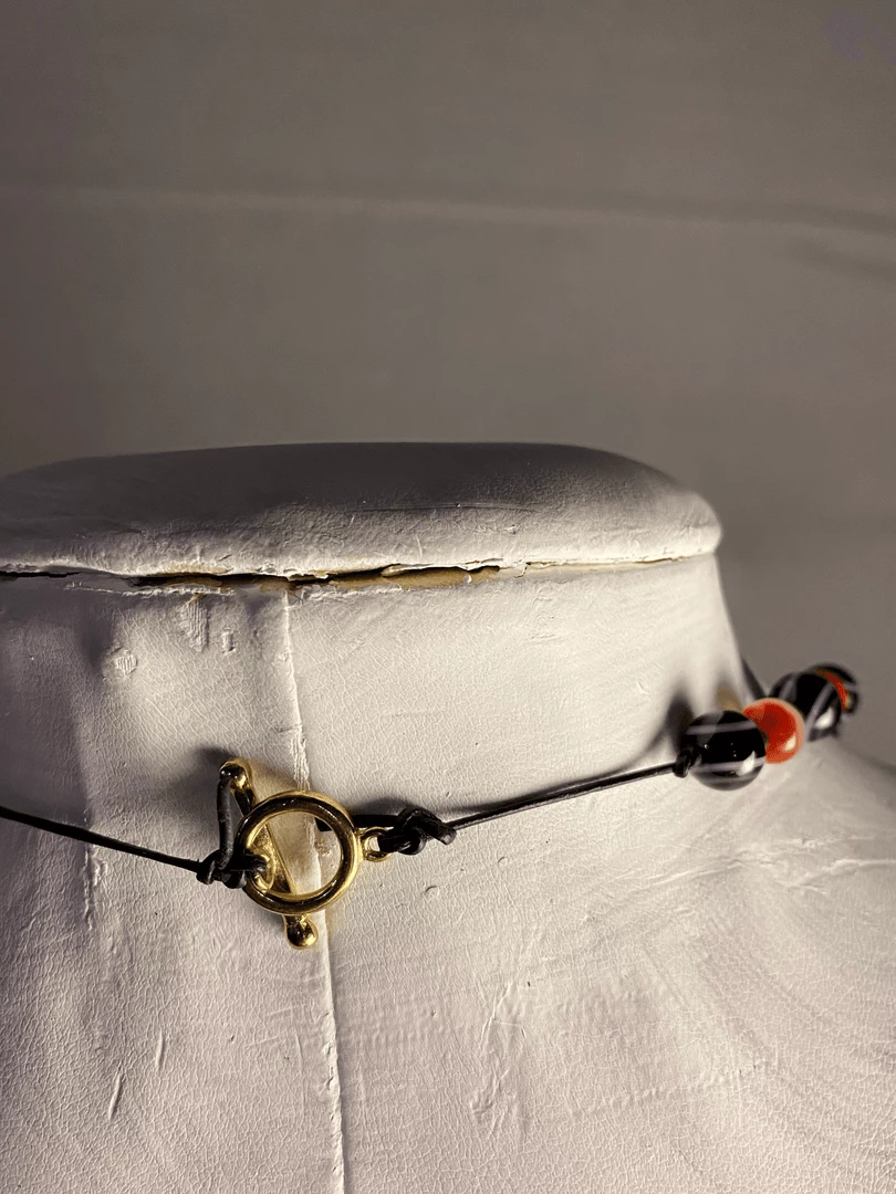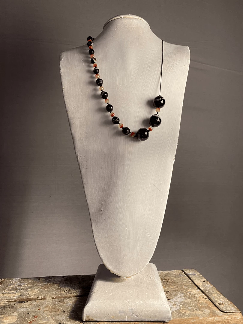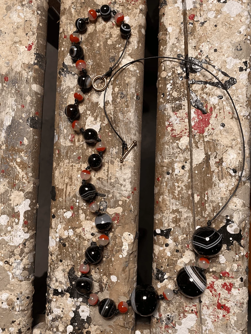 Similar to the constellations, which are strung together to create a more formal shape, the grouping of black banded agate and red Nanhong agate forms an elegant arc when connected by the simple toggle clasp. The necklace measures 18 inches in length.