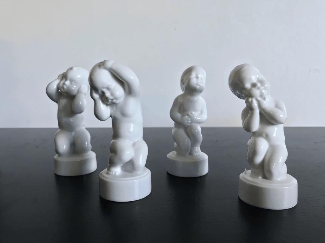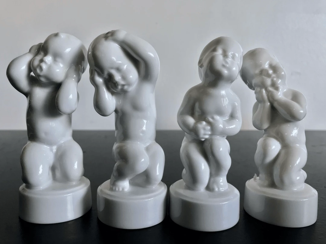 The Four Aches – A set of blanc de chine porcelain figurines designed by Svend Lindhart for Bing & Grondahl, Denmark, 1970s. Each of the tiny sculptures depicts an ache – tooth ache, head ache, ear ache, and stomach ache. 4 1/2 inches tall.Â
