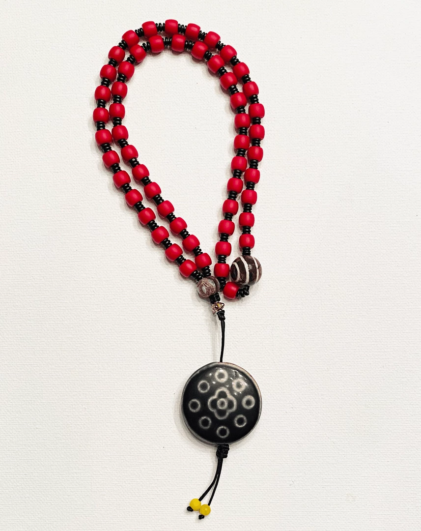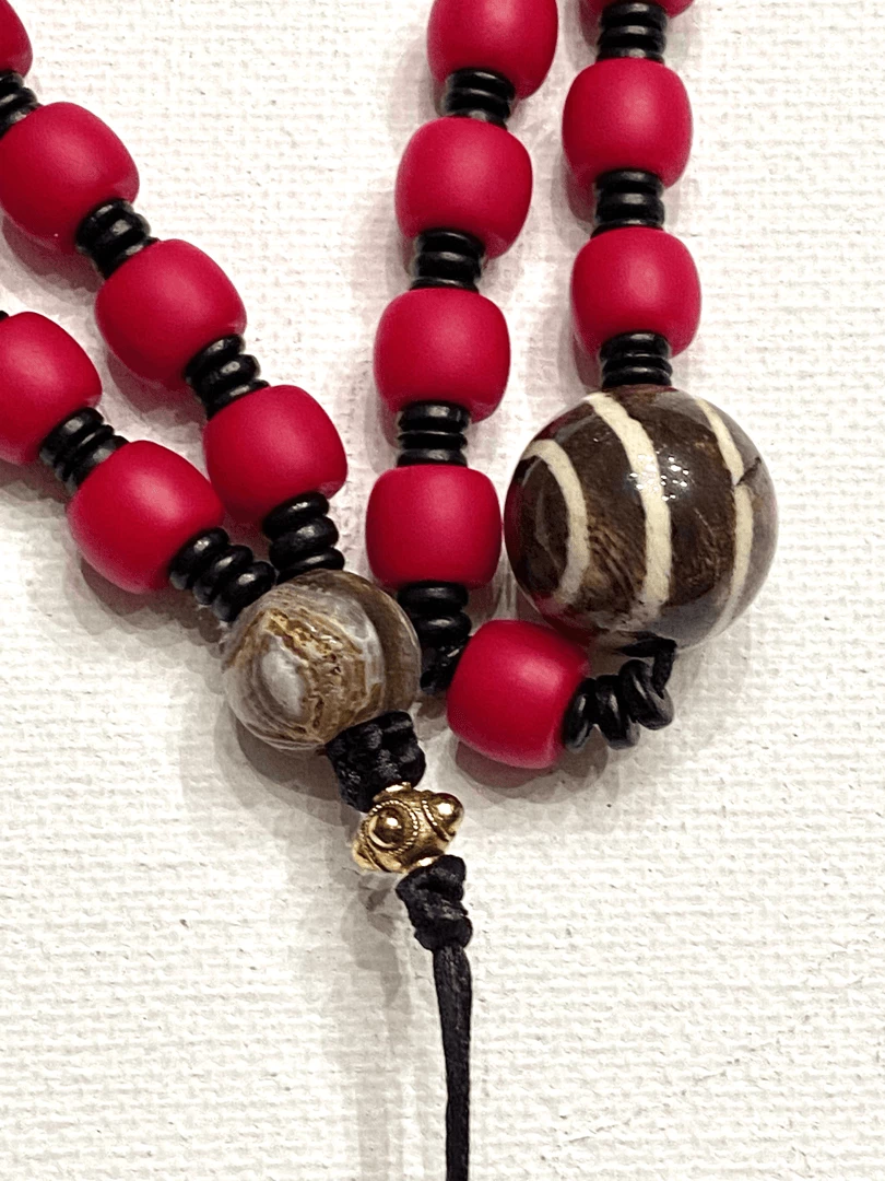 A very special necklace of red Tibetan sherpa glass beads with a round third eye bead, a banded agate bead, and an 18 eye dzi flat round bead. The necklace is adjustable via the slip-knot under the dzi and measures 26 inches. The dzi bead is just over 1 3/4 inches.