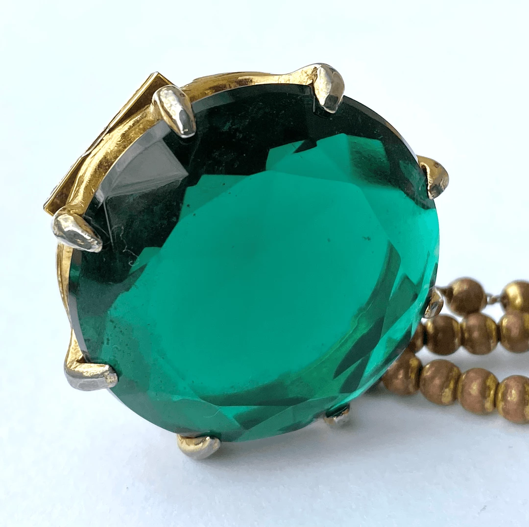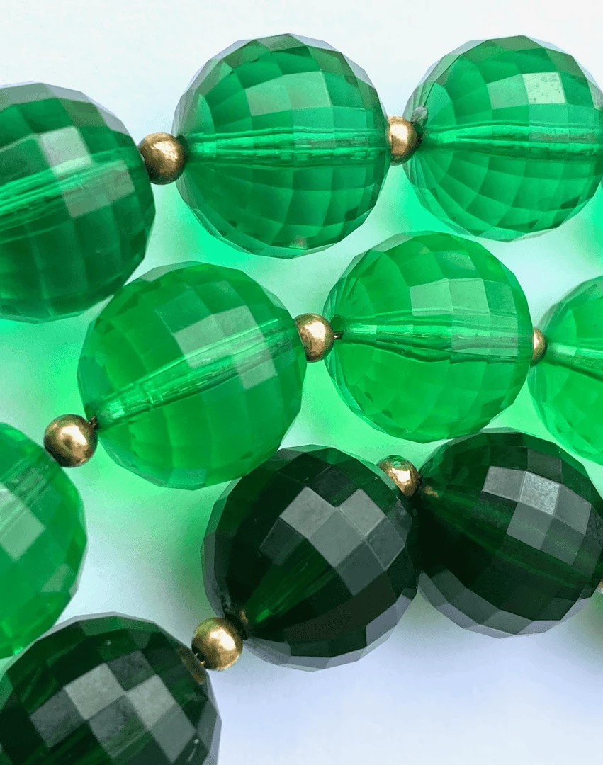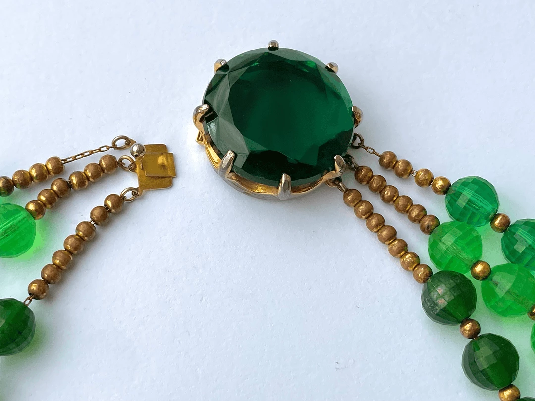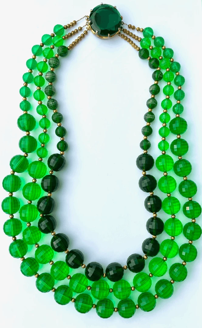 An art deco statement necklace in three tiers of vibrant green faceted round beads. The oversized lucite gemstone closure is an inspired finishing touch. 25″ in length.