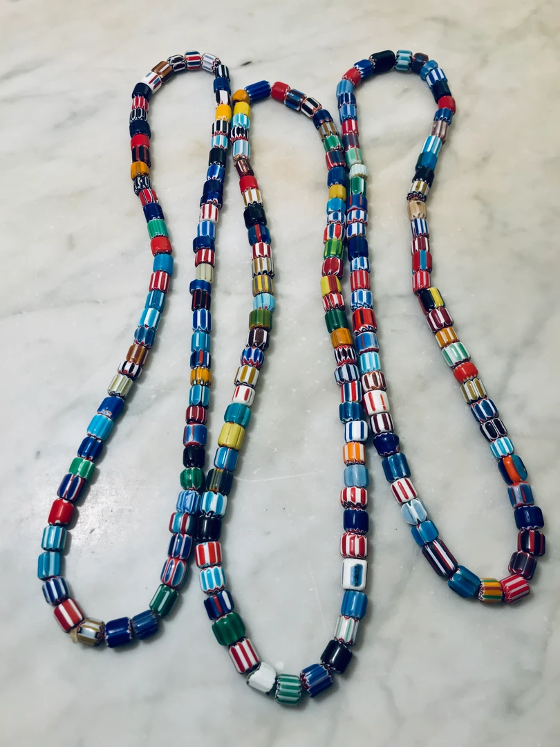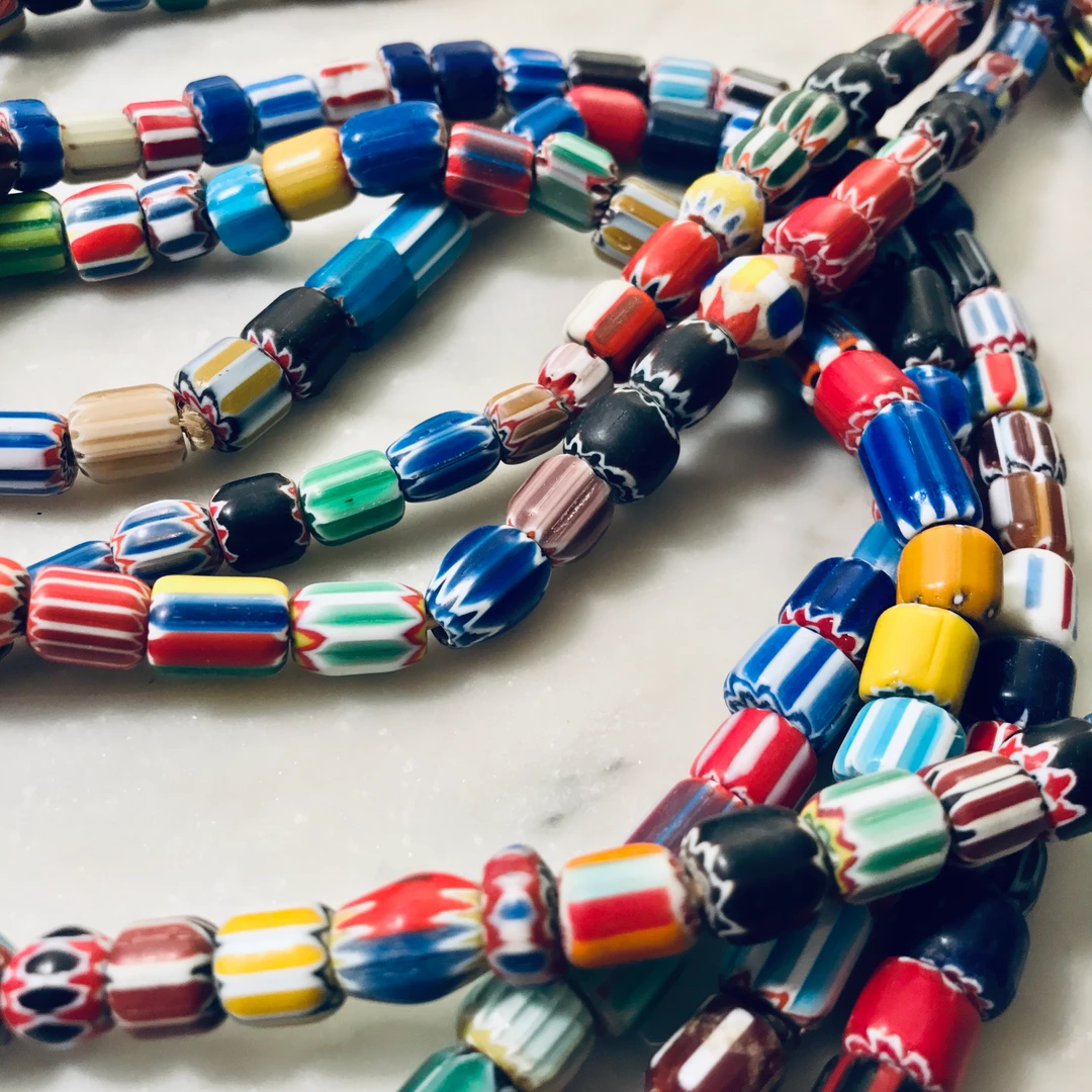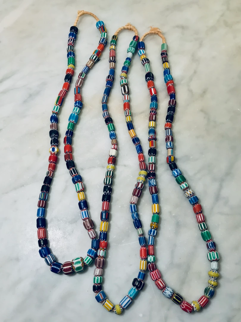 Six strands of marvelous African trading beads. Each strand features chevron Venetian glass beads in remarkable colors, all in very good condition. The strands are all around 24 inches. If you have a request for a specific strand send a note along with your order. Enjoy!