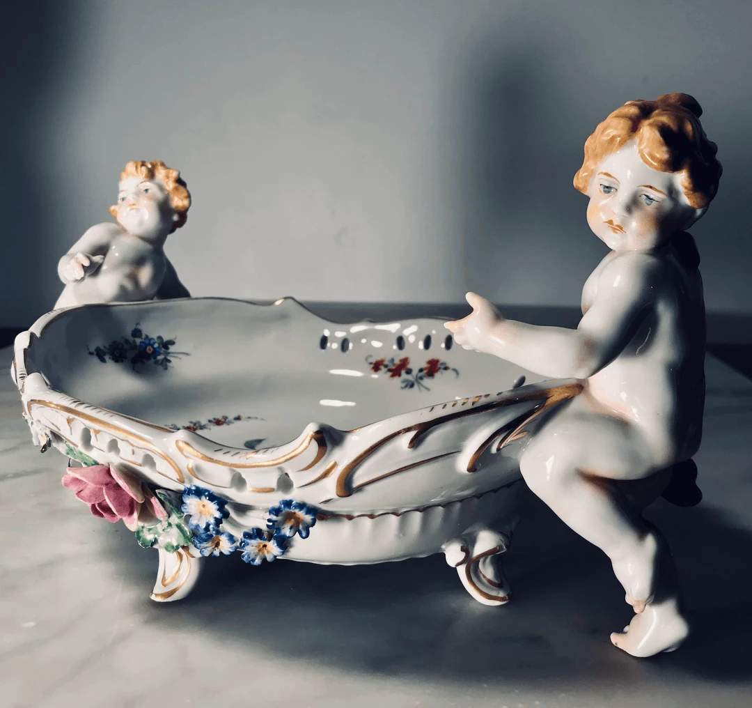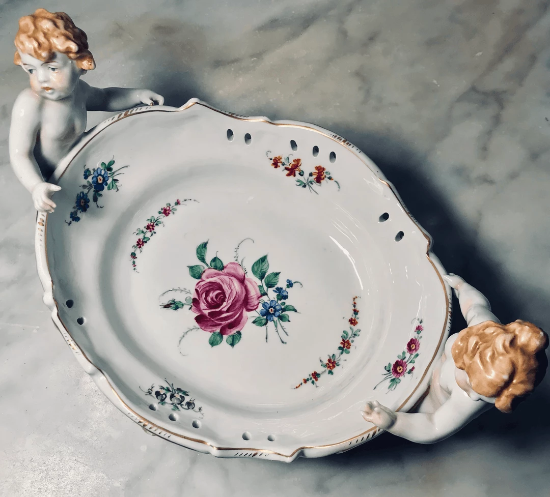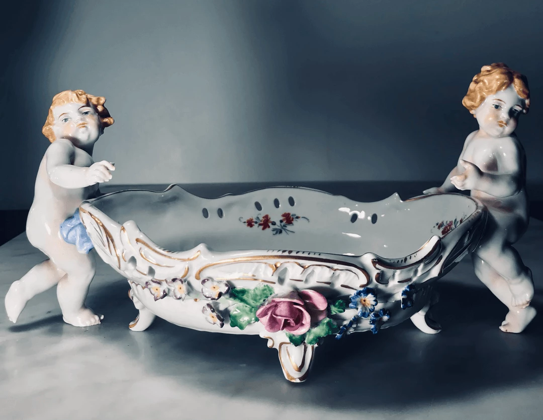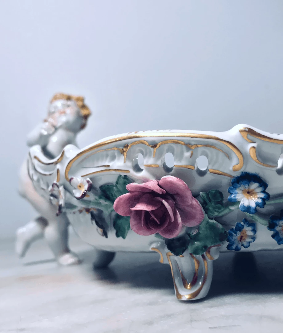 From the German porcelain house of Von Schierholz, circa 1930, this footed dish is presented by two rosy-cheeked putti dancing about the rim. Hand-painted details and applied florals throughout, with the company mark used post-1930. Ten inches in length, four inches in height, and seven inches wide.