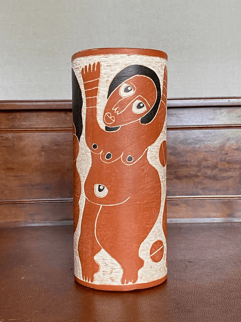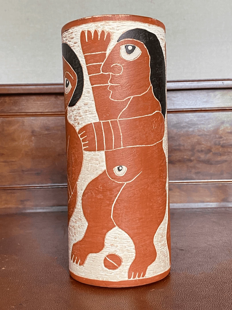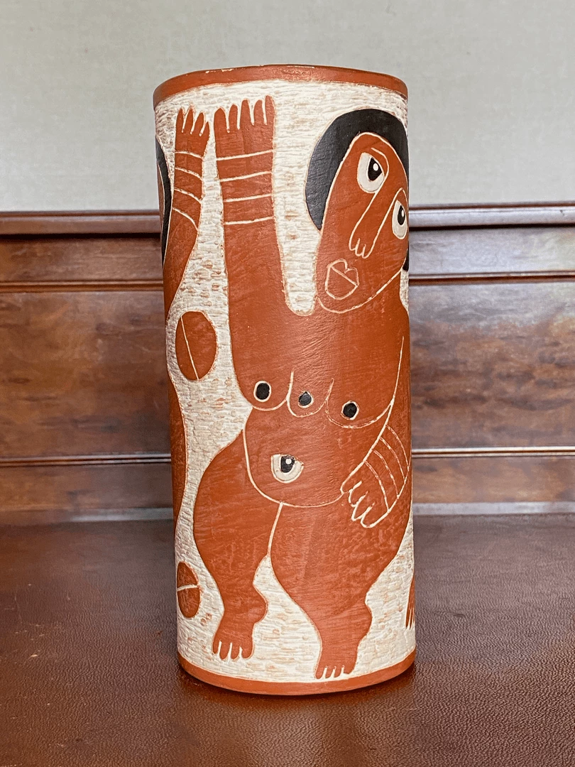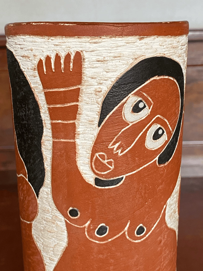 He moved to Martha’s Vineyard, where he continues to create his colorful ceramics and oil paintings. This vase depicts a goddess and celebrates vitality and creation. I am drawn to his ancient themes and pop art aesthetic. 8″ x 4″